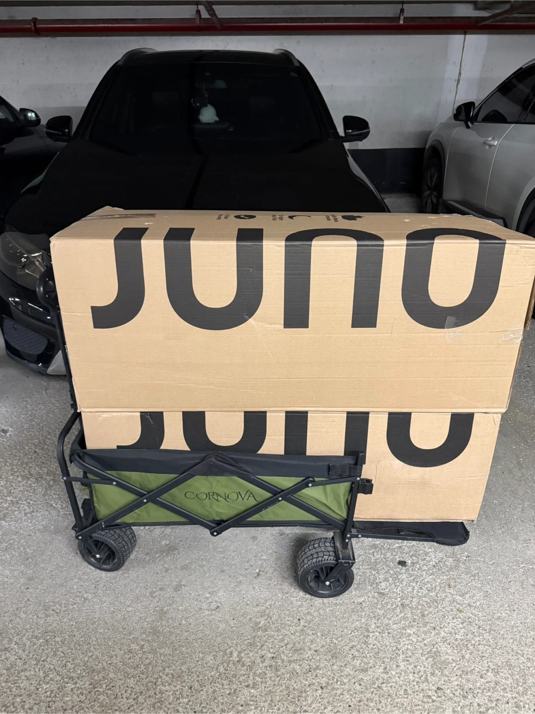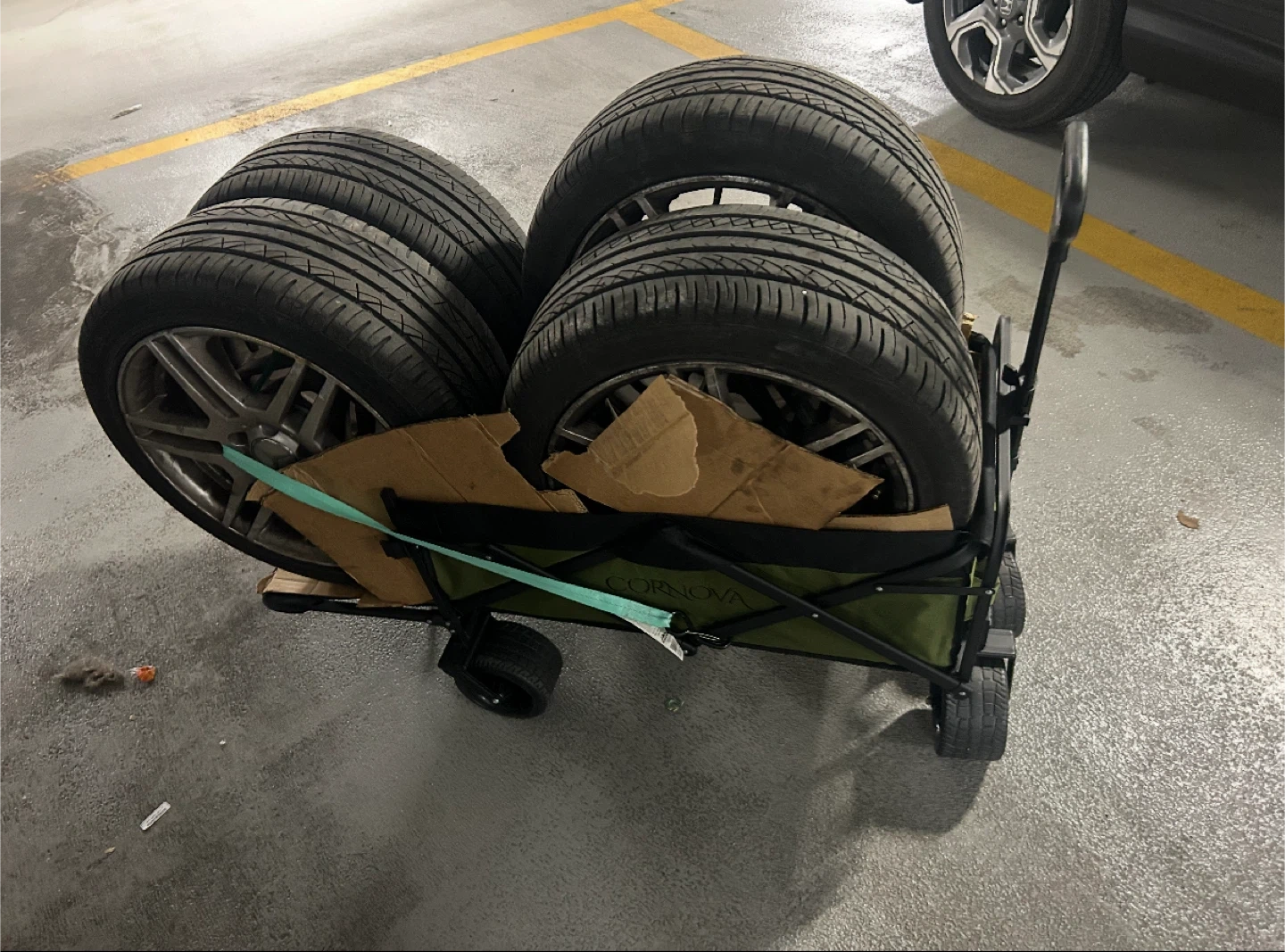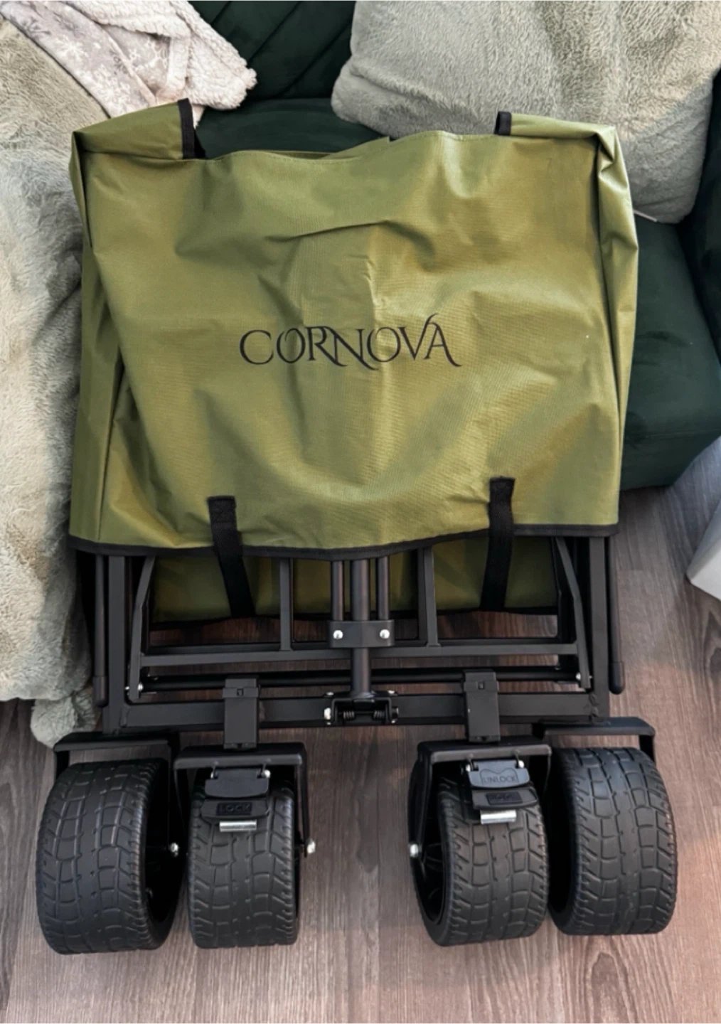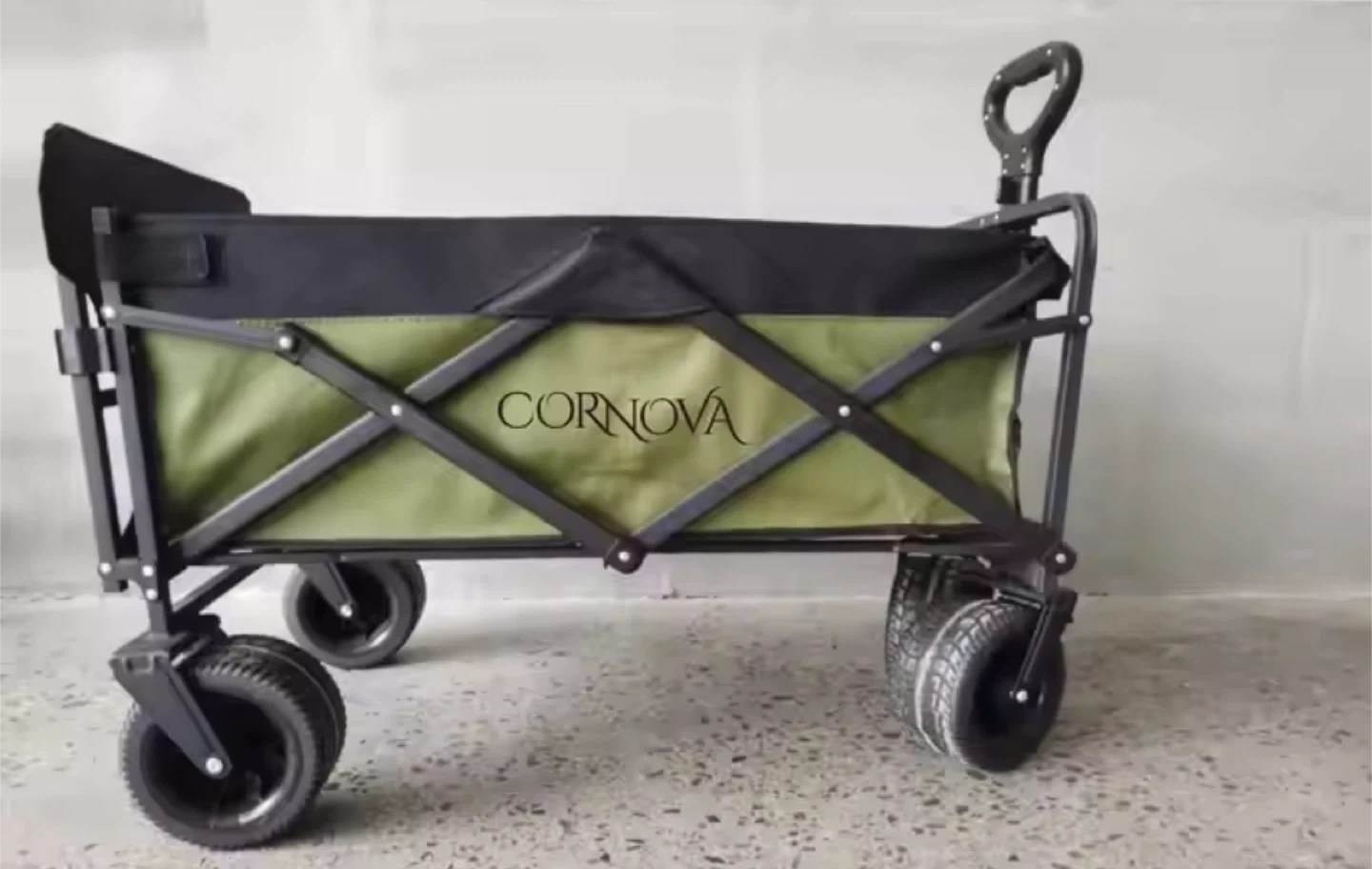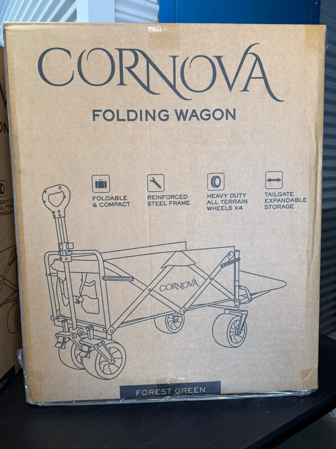 folding wagon in forest green! It's foldable and compact, making it easy to store. It also has heavy-duty all-terrain wheels, a reinforced steel frame, and a tailgate for expandable storage.