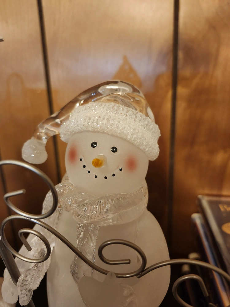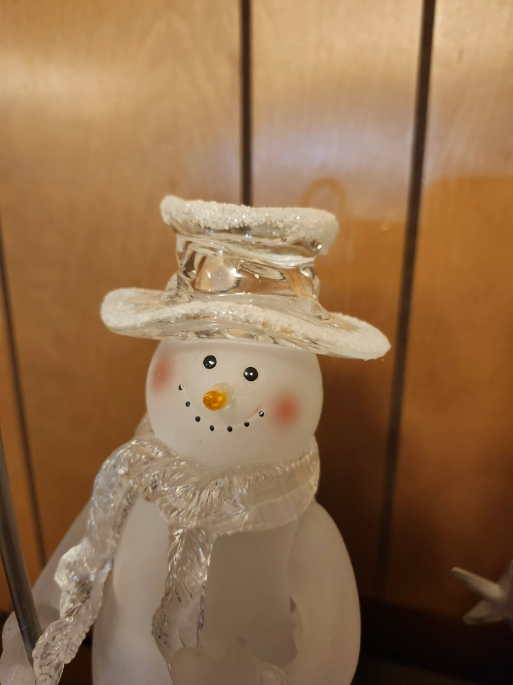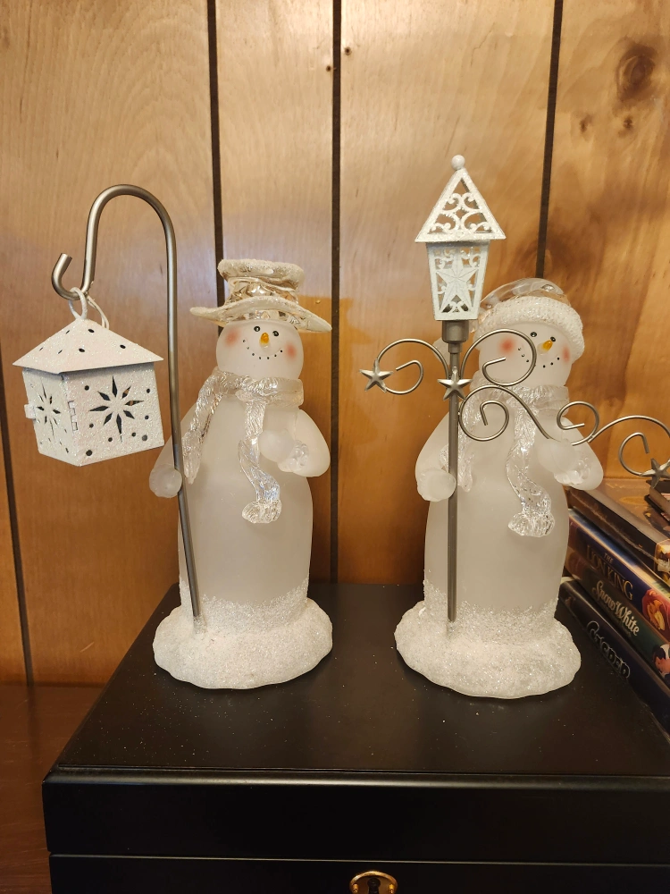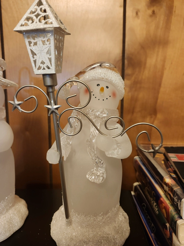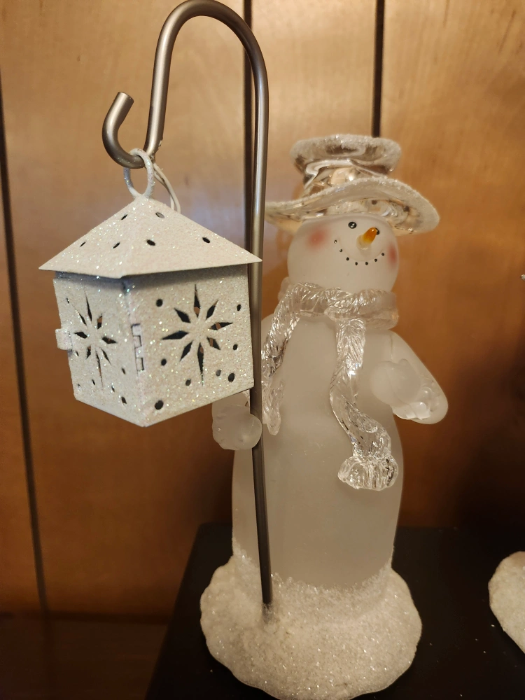 A charming snowman figurine holding a lantern! It's in great condition and would make a lovely addition to your winter decor