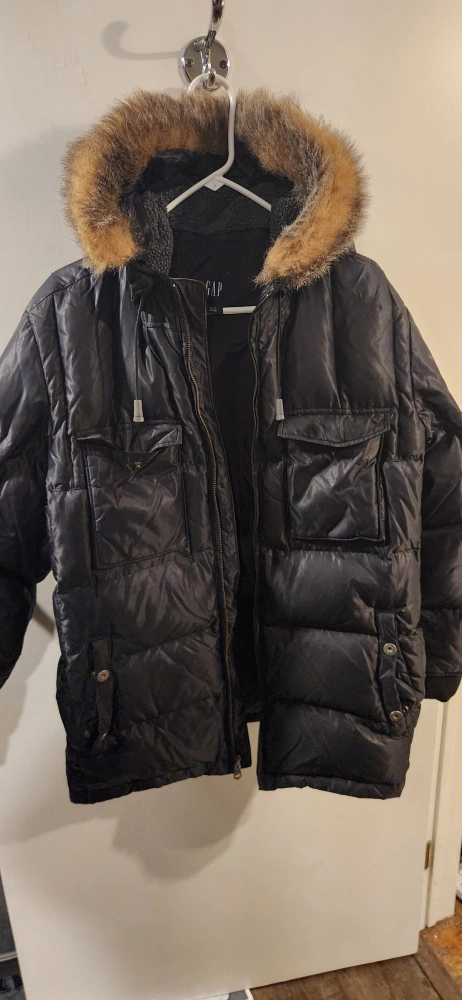 Selling a GAP black puffer jacket in size medium. It's in great condition and perfect for the cold weather! Features a fur-trimmed hood and plenty of pockets to keep your belongings safe and sound.