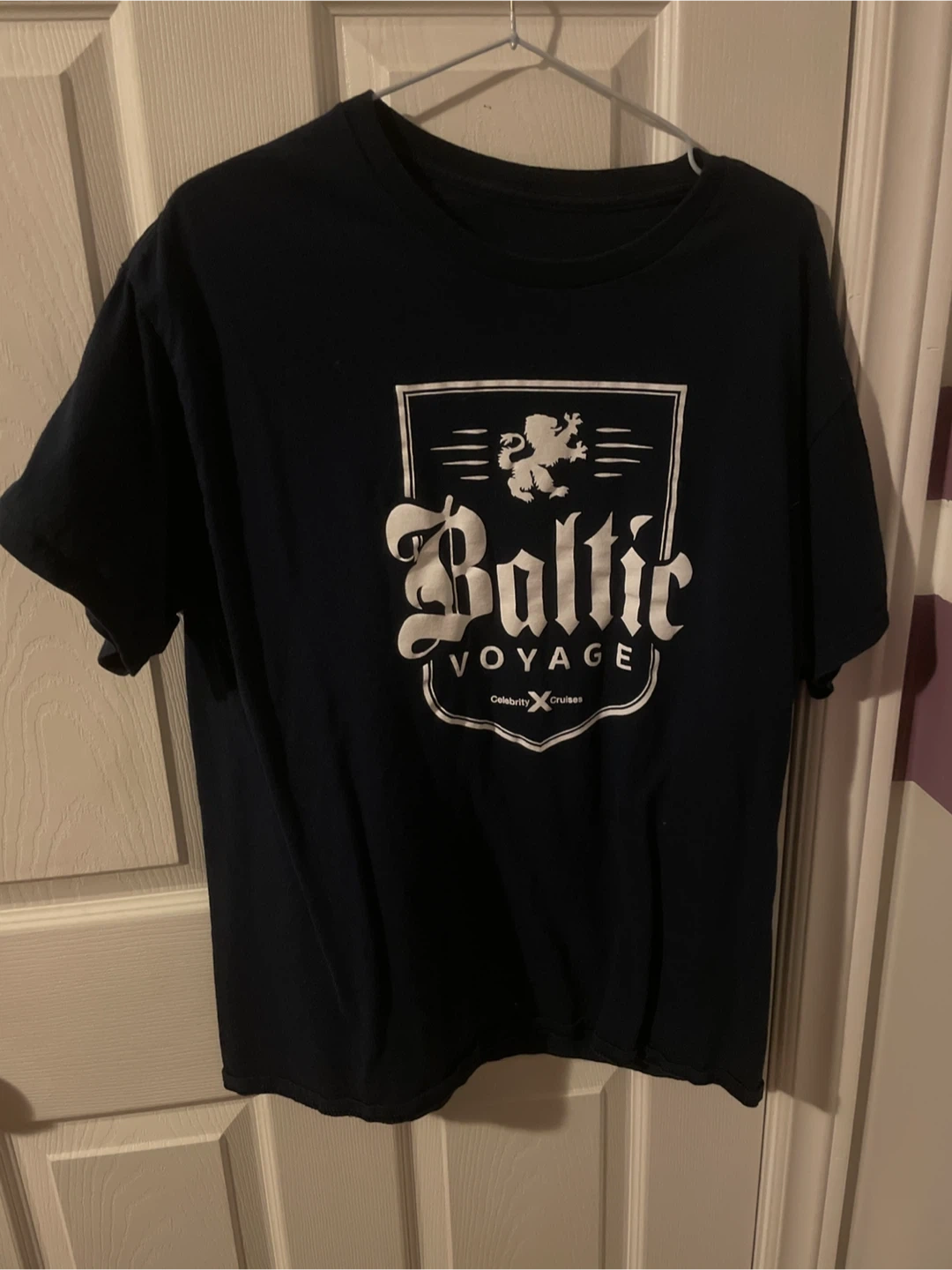 Selling a navy blue t-shirt from Celebrity Cruises Baltic Voyage. It has a cool logo on the front. Perfect for cruise lovers or anyone who wants a unique shirt!