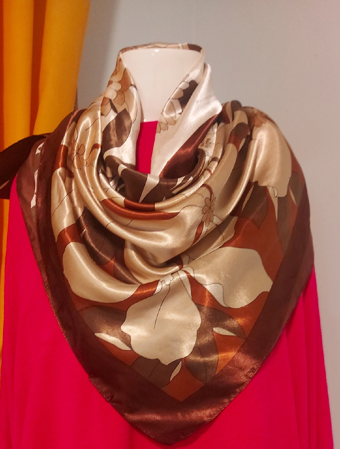 579Beautiful floral print scarf in brown and beige tones! It's in great condition and would make a lovely addition to any outfit. The material feels silky and smooth. Perfect for adding a touch of elegance to your look