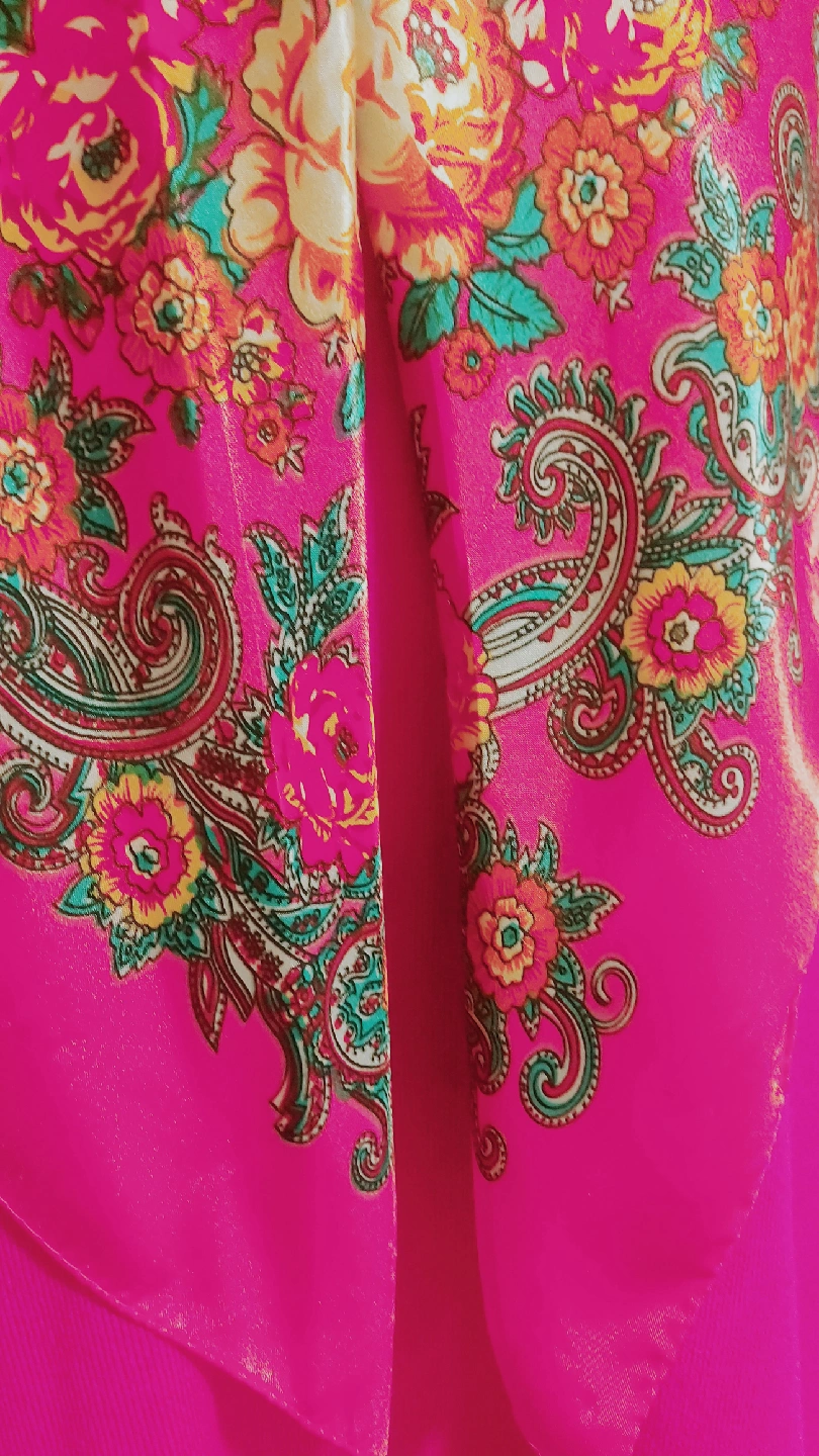 530Beautiful vintage pink scarf with a vibrant floral design! It's in great condition and ready to add a pop of colour to your wardrobe