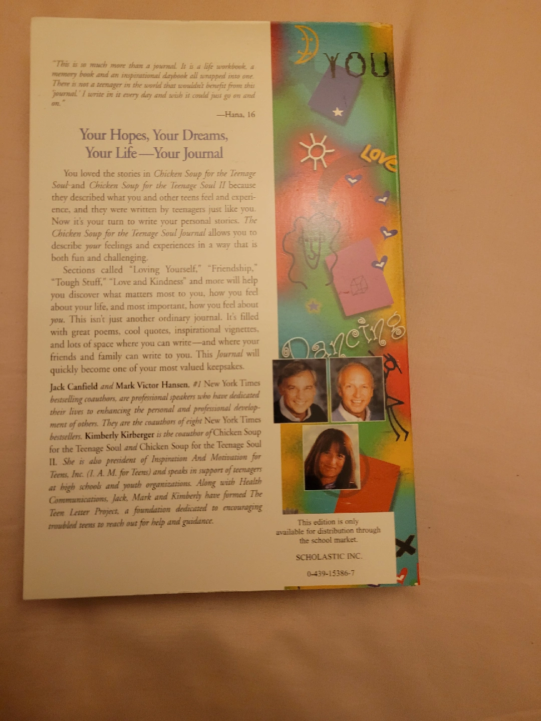 Selling a copy of Chicken Soup for the Teenage Soul Journal by Jack Canfield, Mark Victor Hansen, and Kimberly Kirberger. This is a great journal for teens to explore their thoughts and feelings. It's filled with great poems, cool quotes, inspirational vignettes, and lots of space where you can write and where your friends and family can write to you