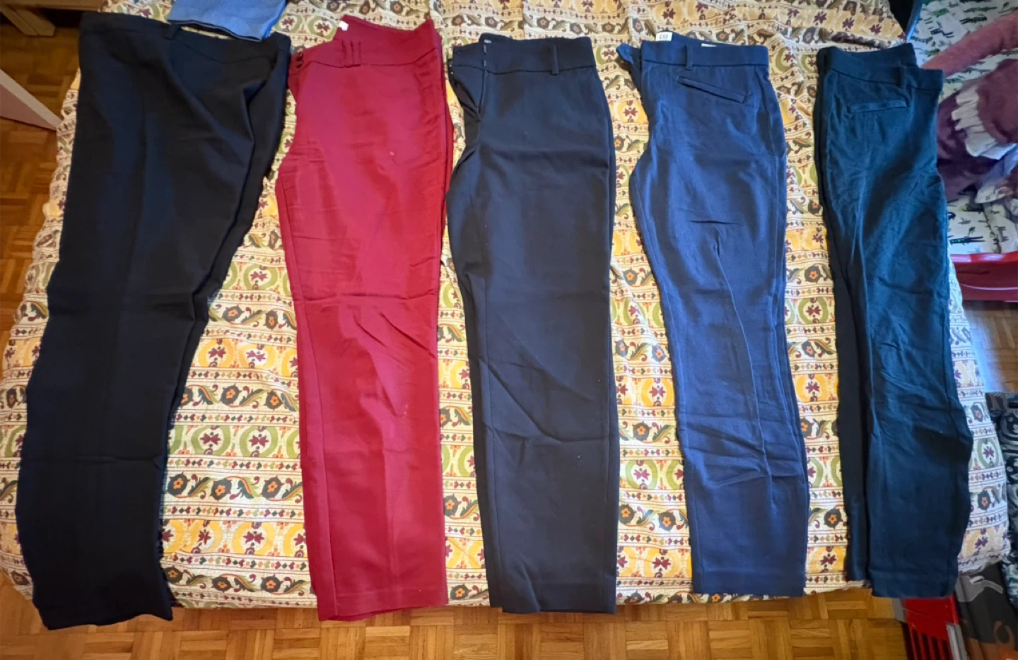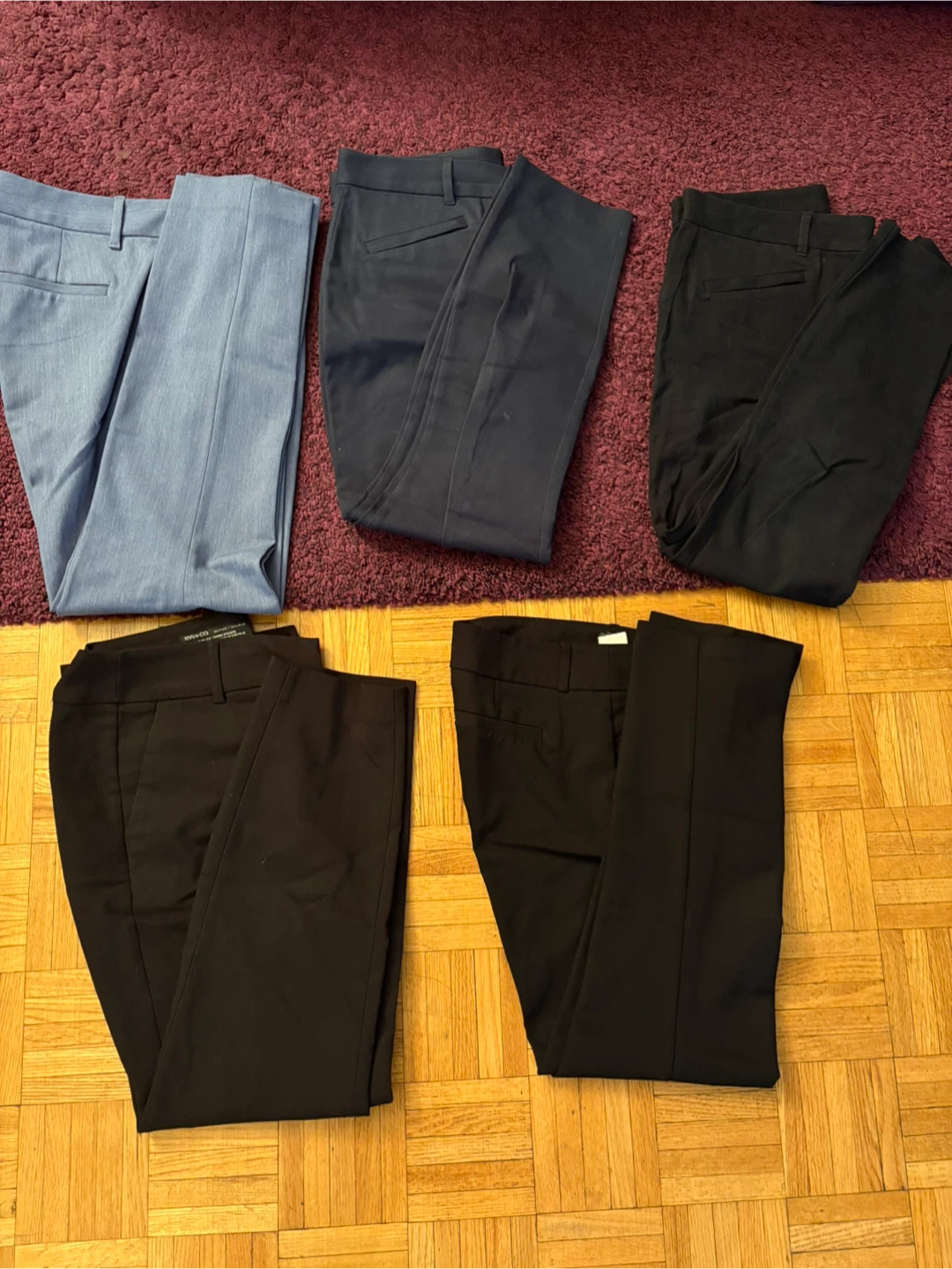 Selling a lot of five pairs of women's dress pants! There are varying shades of blue and black. Great for work or business casual. Please take a look at the photos for details!