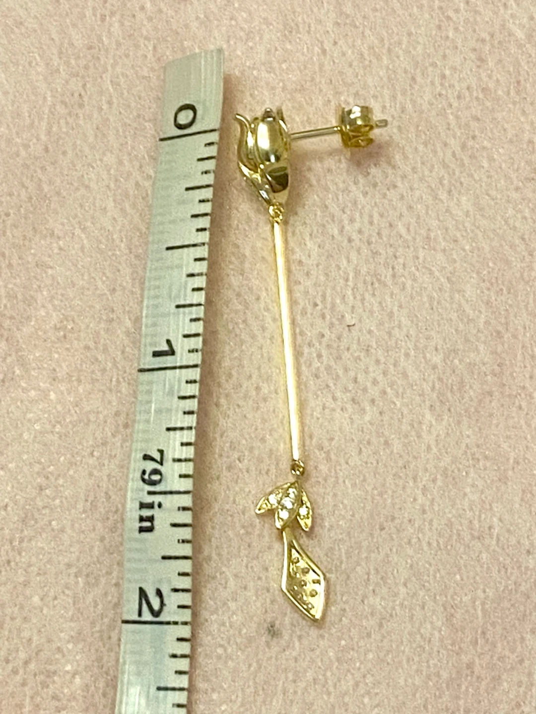 These are a pair of gold-tone tulip dangle earrings. They are in great condition and would make a beautiful addition to any outfit! The earrings feature a unique design with a tulip motif and small diamond-like accents.