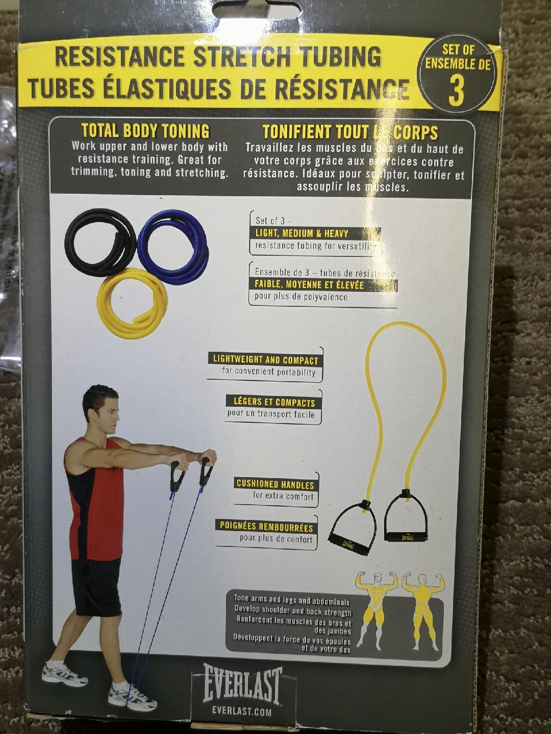 Everlast Resistance Stretch Tubing Boxed set of 3 resistance stretch tubing of different strengths. - Blue - Black - Yellow The pair of handles have a slide mechanism to lock / unlock the tubing anchor points. Making it easy to change the tubes. Great for calisthenics. Comes with original box + instruction manuals. Pickup in Ranchlands in NW Calgary.