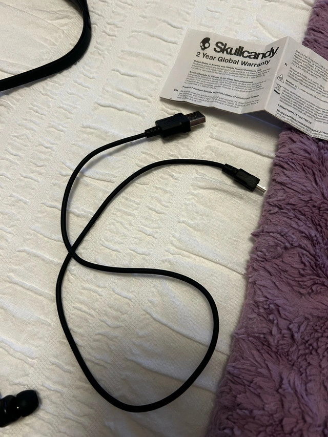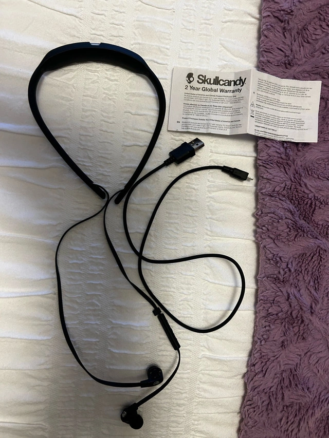 Listen to your favourite tunes on the go with these Skullcandy cordless headphones! These headphones feature a comfortable neckband design and deliver impressive sound quality. They are in good condition and come with a charging cable and warranty information. * Neckband style for comfortable wear * Cordless design for freedom of movement * Good condition, gently , well-maintained * Includes charging cable and warranty info. Feel free to message if you have any questions!
