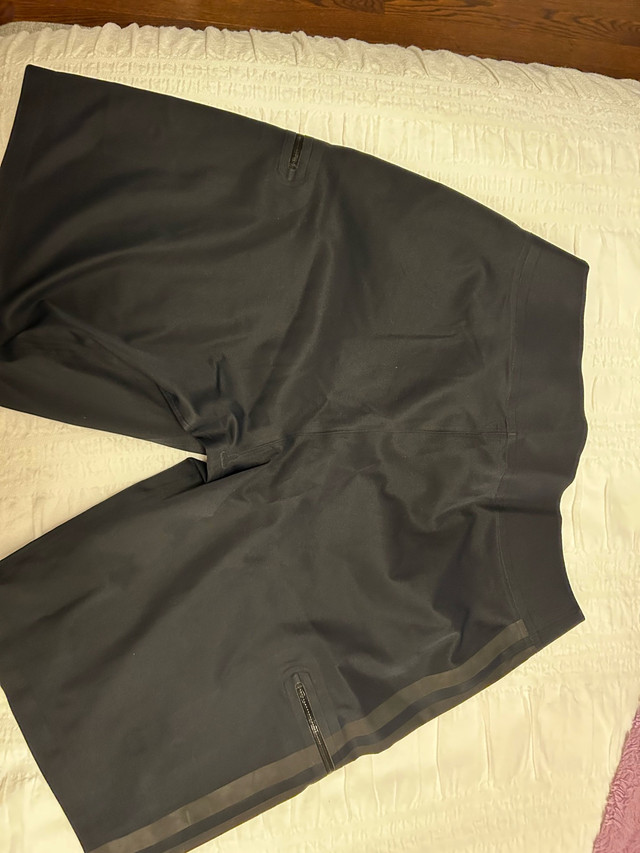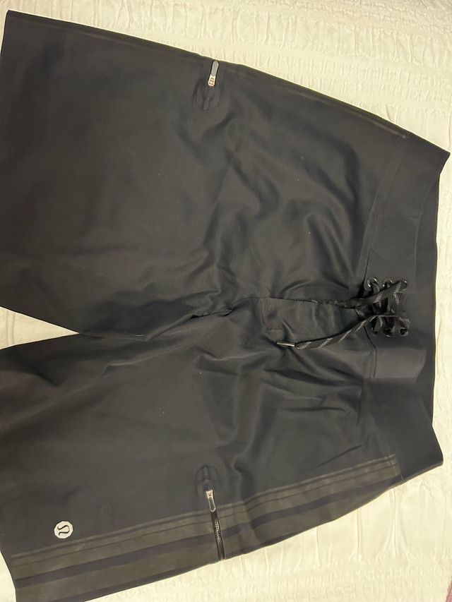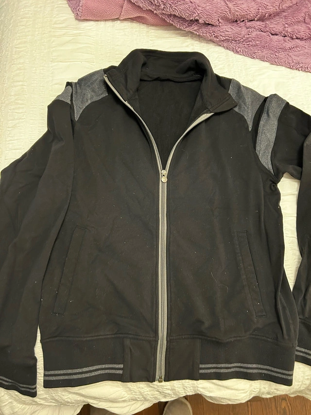 This is a used Lululemon black jacket with gray accents, perfect for workouts or casual wear, and a pair of black Lululemon shorts. Both items are in good condition and ready for a new home. Size Medium Jacket $25 Shorts $15 Take both for $30
