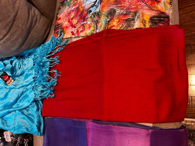 5 NEW SCARVES all for $50 that’s $10 per scarf Accessorize your wardrobe with this array of vibrant scarves! New with tags still on, these scarves come in a variety of patterns and colours. Perfect to spice up any outfit. Don't miss out on this fantastic deal! If the ad's still up the scarves are still available!