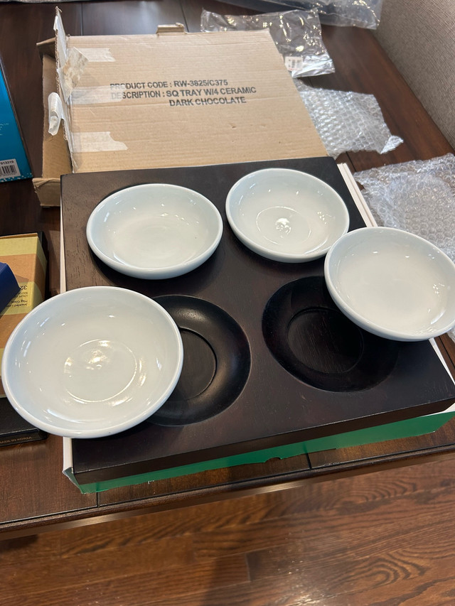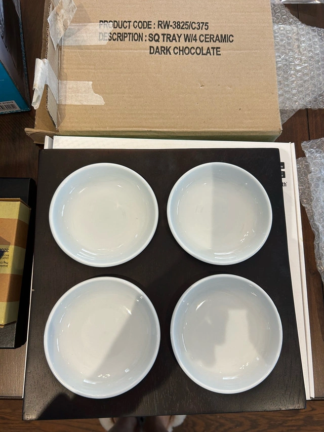 I'm selling a brand new, never used set of four ceramic ramekins. These stylish dark chocolate serving dishes will add a touch of elegance to your dining experience. They are perfect for individual desserts, sauces, or condiments. The set comes in its original box, ensuring they are pristine and ready to use. This square tray with four ramekins is perfect for adding a touch of elegance to your table. Specifications: * Material: Ceramic * Colour: Dark Chocolate * Quantity: 4 ramekins per set * Condition: New in box if the ad's still up, it means these little gems are still waiting for a new home!