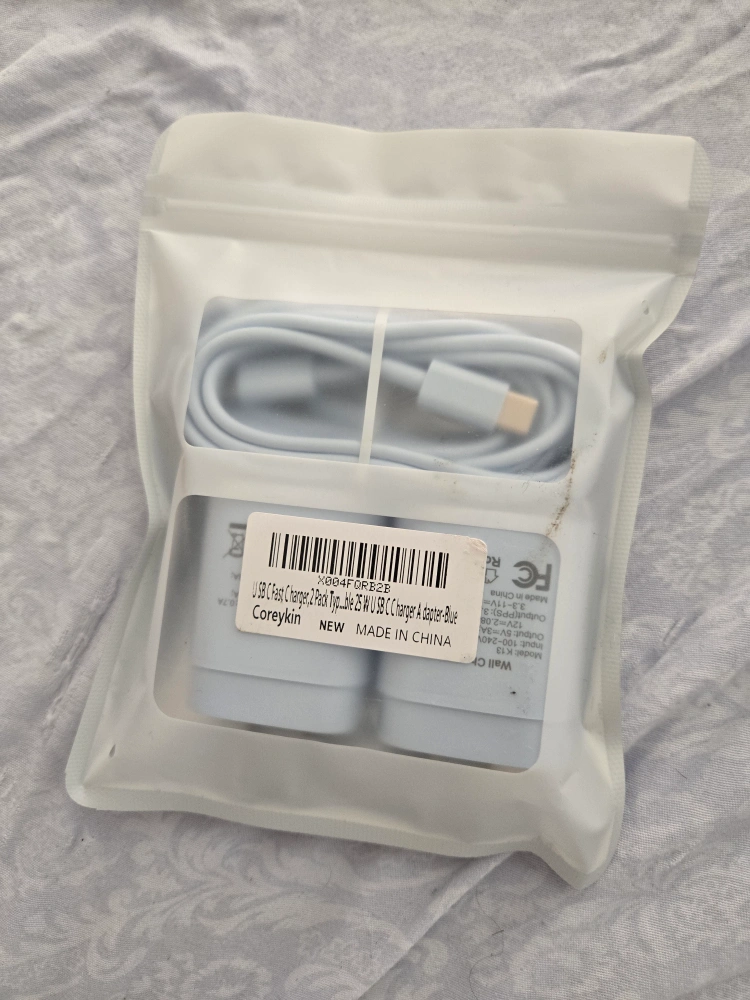 Selling a brand new Coreykin USB C Fast Charger 2-Pack in blue! It includes a cable and two 25W USB C charger adapters
