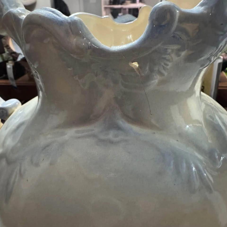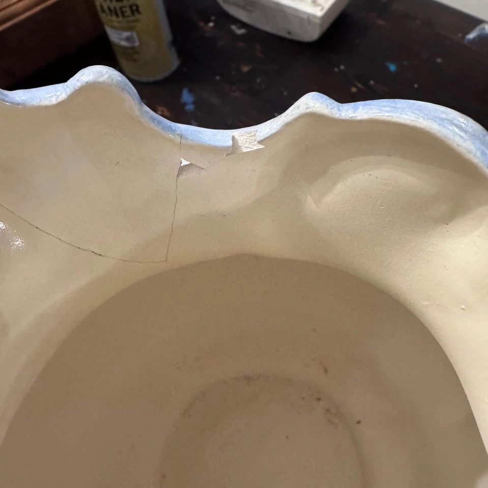 Small chip and signs of repair. Price reflects this. Similar ones are priced much higher. This vintage set features a blue-hued floral pattern on a white base. It is a handmade ceramic set, manufactured in the United States, likely from the 1950s. The set is considered a charming addition for farmhouse-themed decor or collectors of vintage pottery.