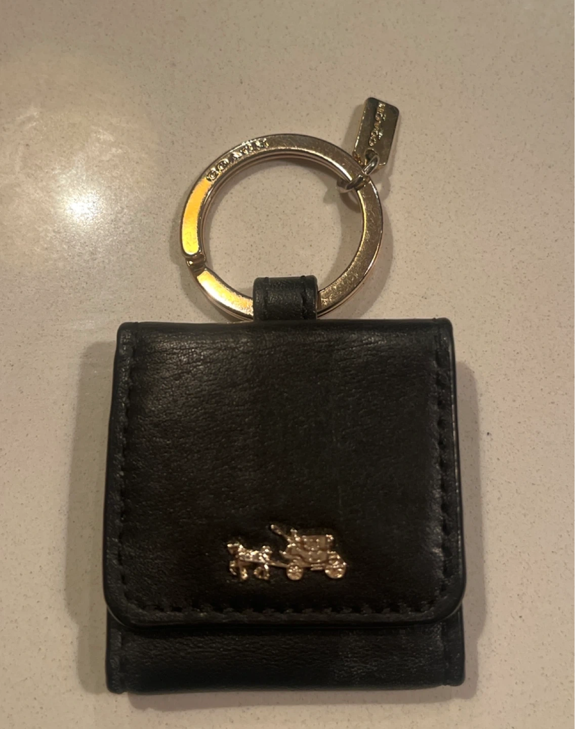 The inside of the keychain has a slot for a photo. Genuine black leather with the classic Coach horse and carriage logo in gold. Perfect for attaching to your keys or bag.
