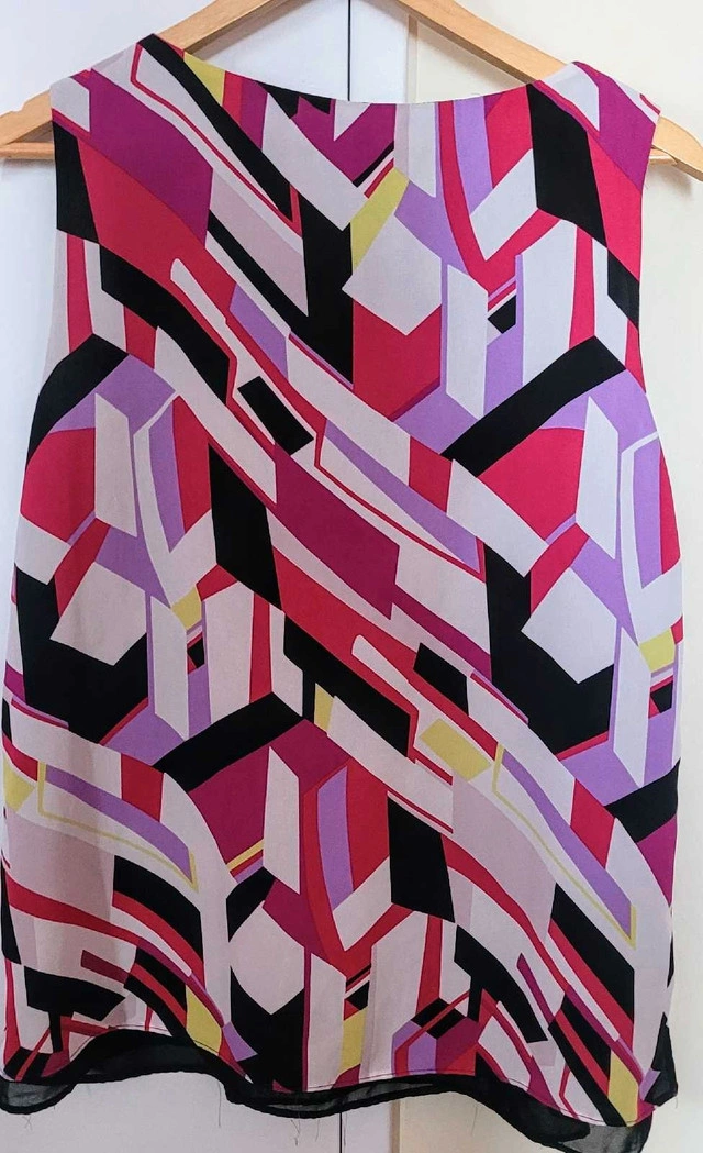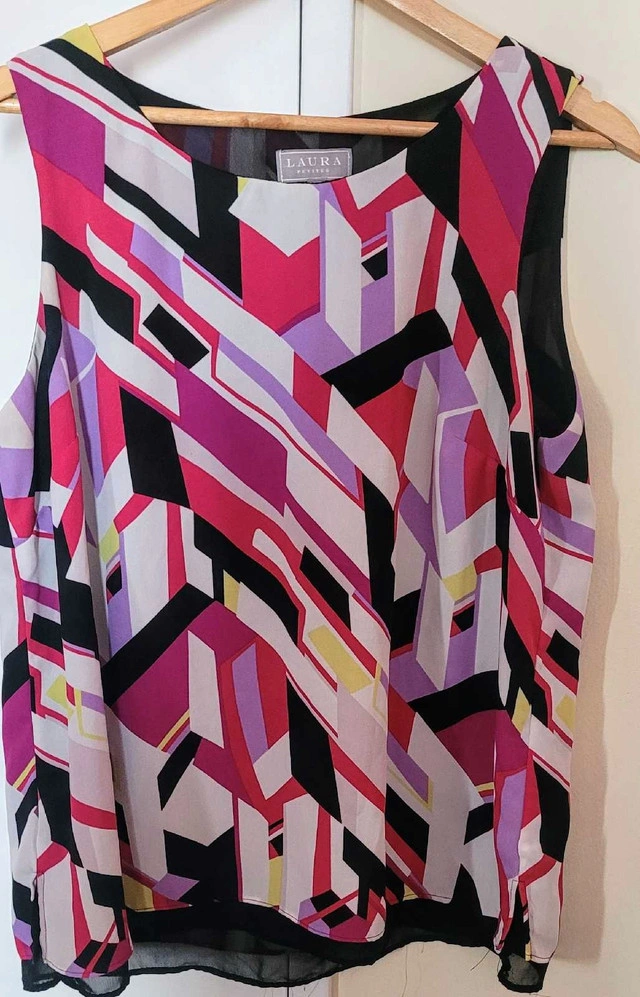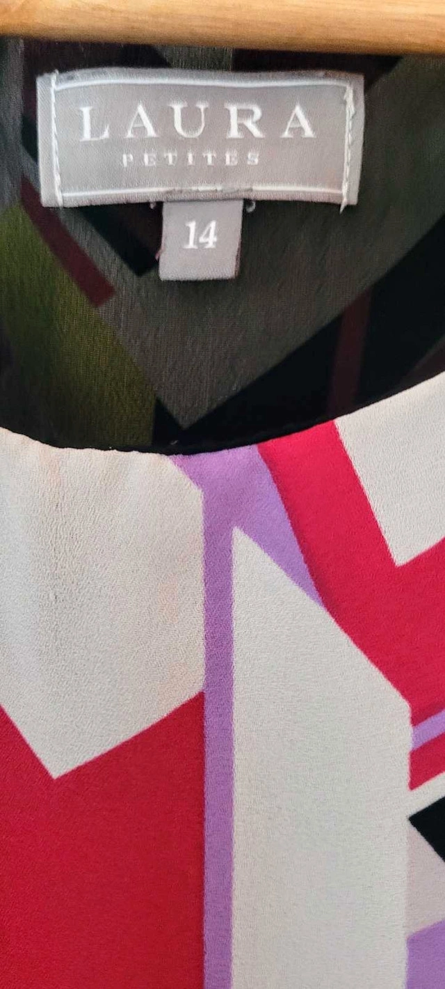 This is a Laura Petites size 14 blouse with a colourful geometric pattern. This pre-owned top is in good condition, ready to add a pop of colour to your wardrobe. Specifications: - Brand: Laura Petites - Size: 14 - Colour: Multi-coloured geometric pattern This blouse is priced to sell, reflecting its pre-owned condition. I'm asking $18, which is a fair price, given the brand and condition. If the ad's still up, the blouse is still available. Happy shopping!
