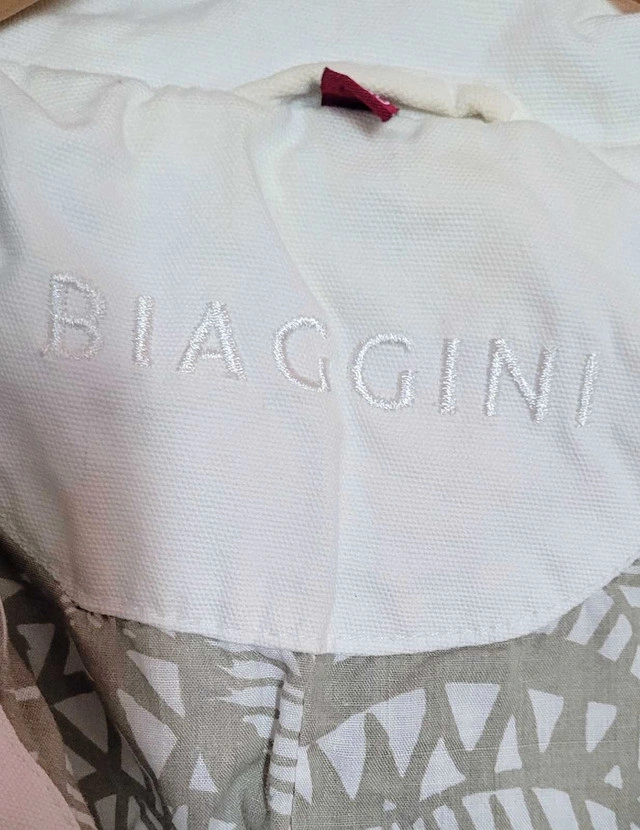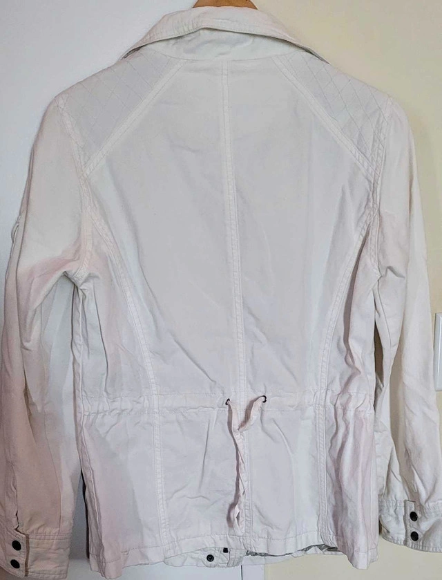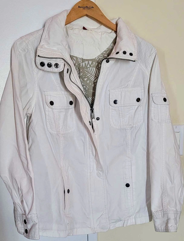 This is a stylish Biaggini cream-coloured jacket in size EUR 40 (Medium), perfect for transitioning between seasons. The jacket is in good, used condition, showing minor signs of wear. It features multiple pockets and a unique design. The measurements for this jacket are shoulder width 42cm and overall length of 60cm. Here are some details: * Brand: Biaggini * Size: EUR 40 (Medium) * Colour: Cream * Material: Cotton Blend * Closure: Zip and Buttons This jacket is waiting for a new adventure, maybe a trip to the farmers market, or a casual stroll on the boardwalk? If the ad is up, the jacket is still available!