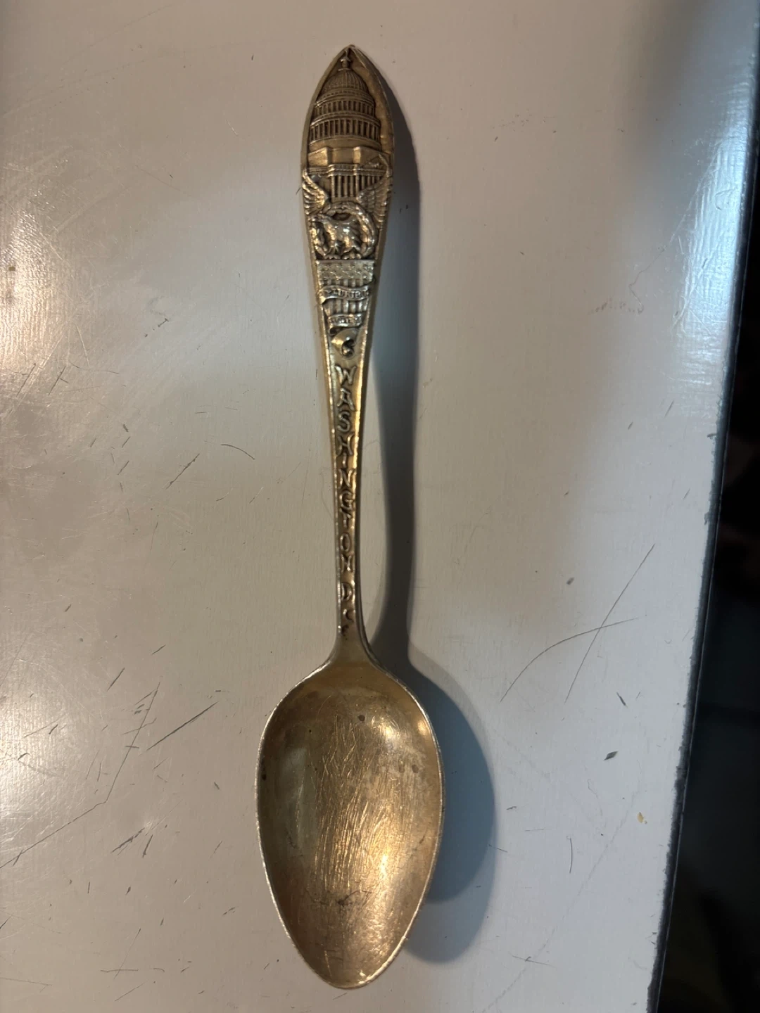 Selling a vintage silver plated spoon. The spoon is marked "Wm Rogers Mfg Co". The capitol building in Washington DC