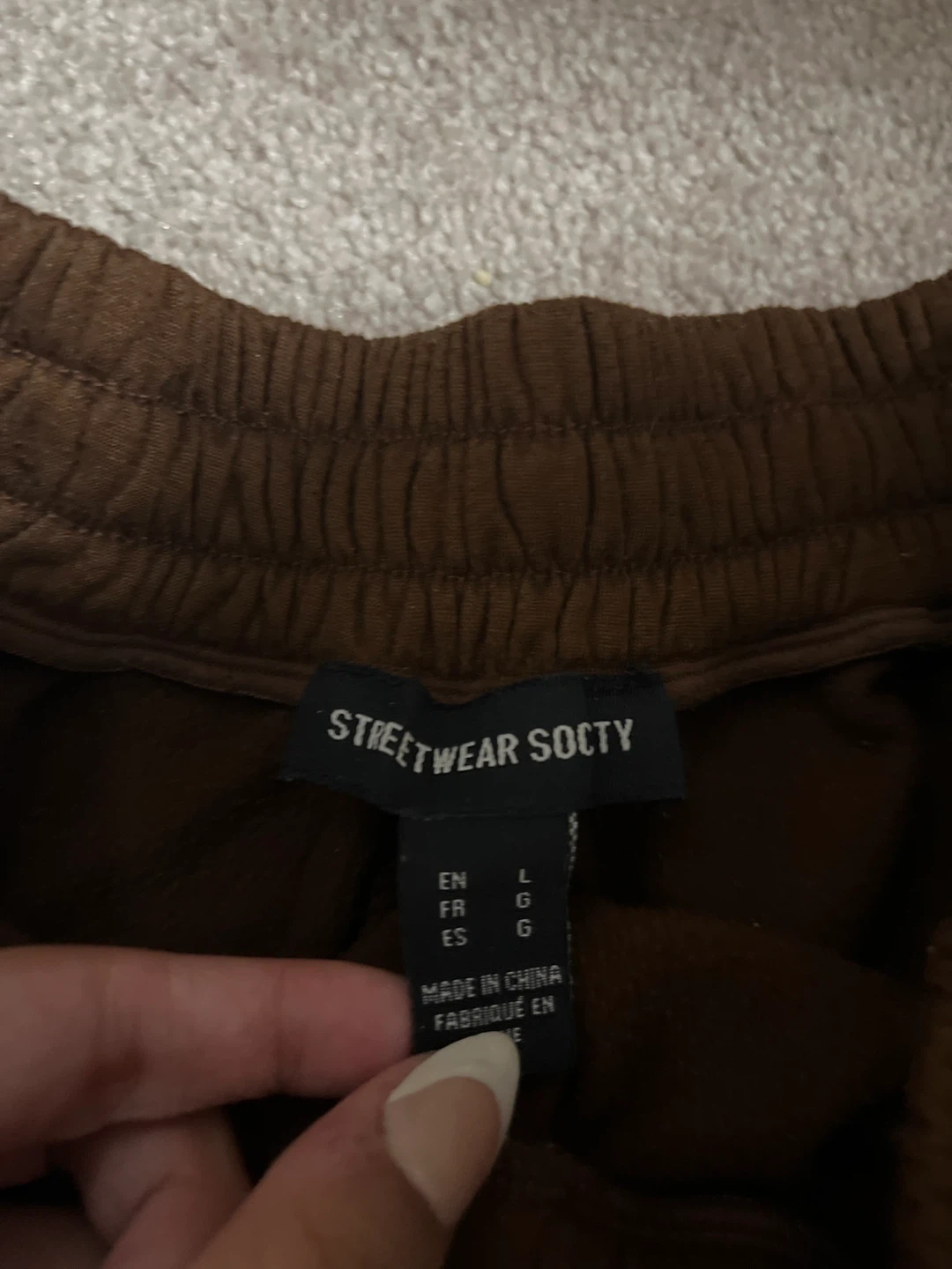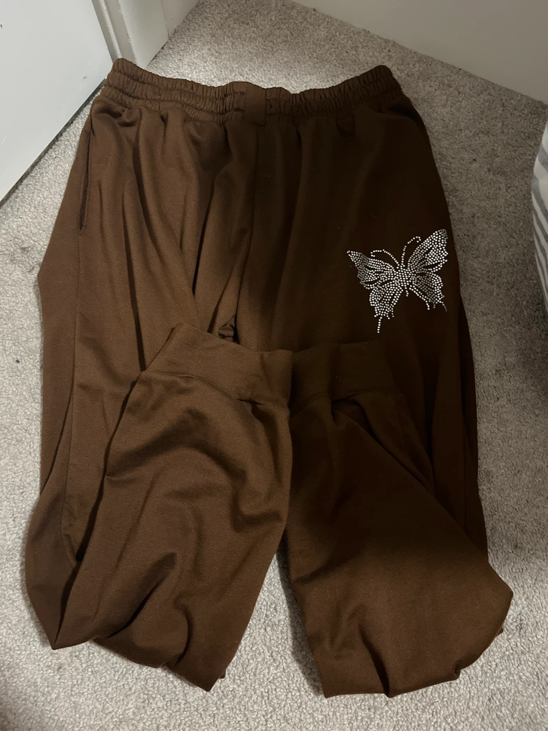 Selling a pair of brown sweatpants from Streetwear Socty! They feature a sparkly butterfly design on the leg. The size is L.