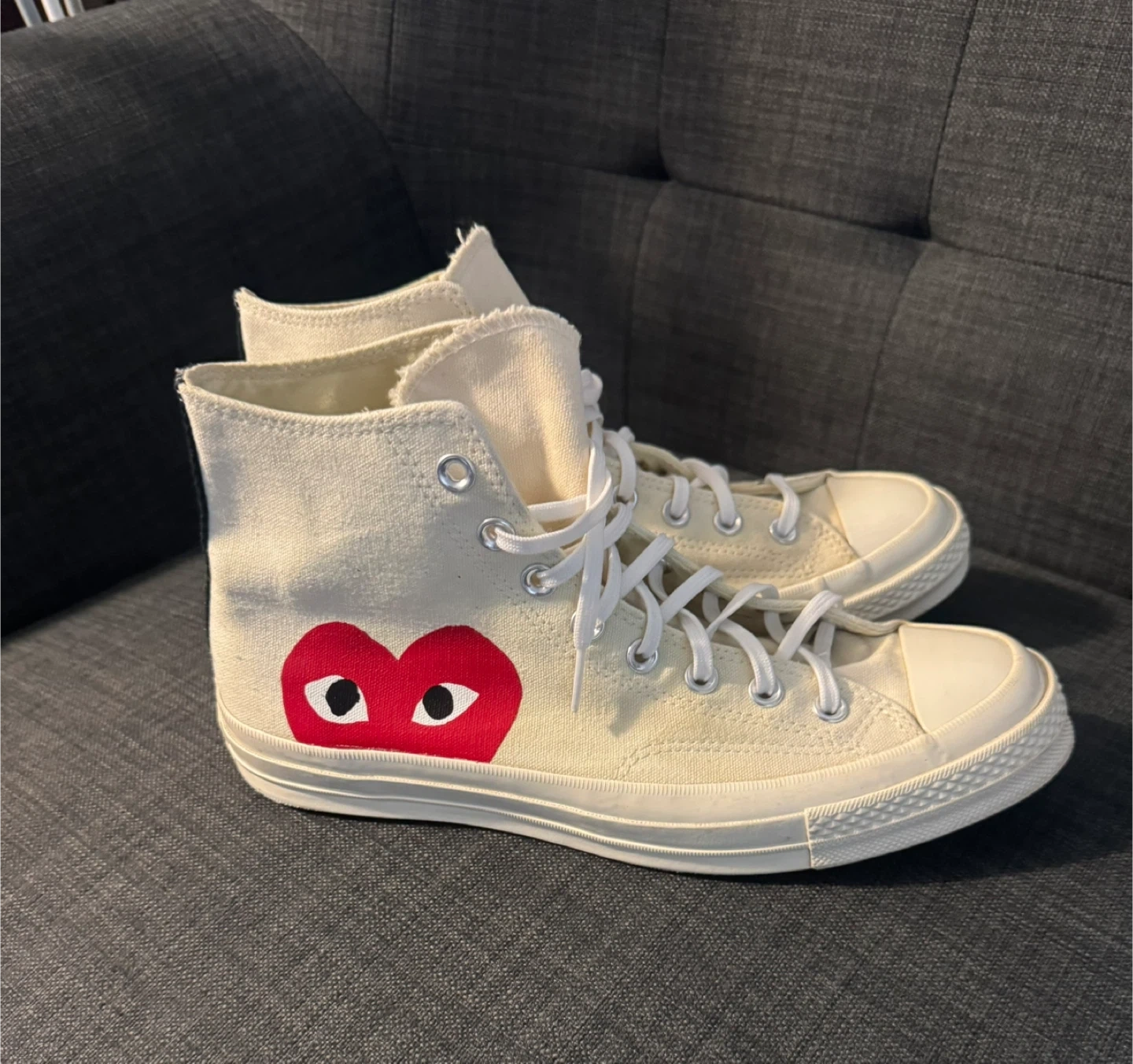 Selling a pair of Converse Chuck Taylor All Star high-tops in a cream colour, featuring the iconic Comme des Garçons heart logo! They're in great condition and are a size 9 (US/CA).