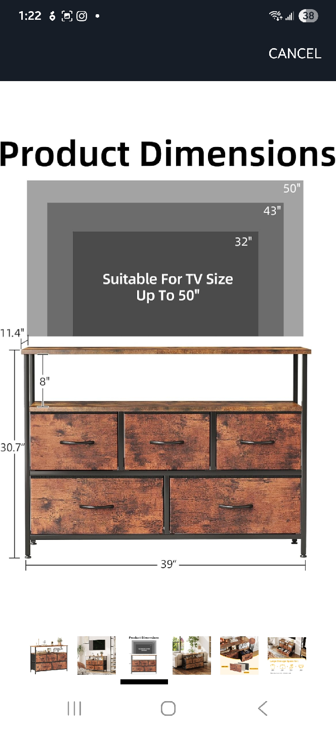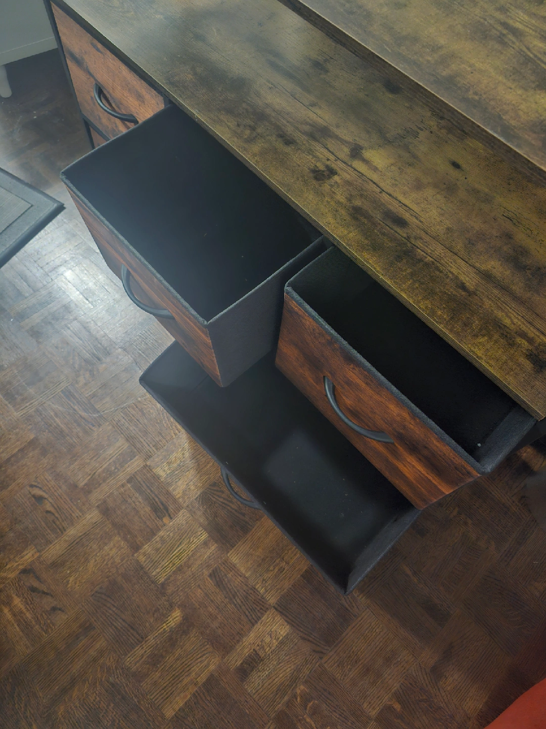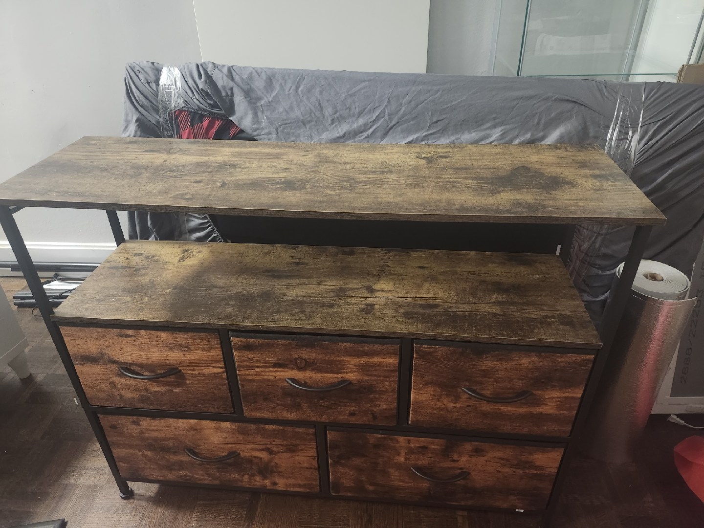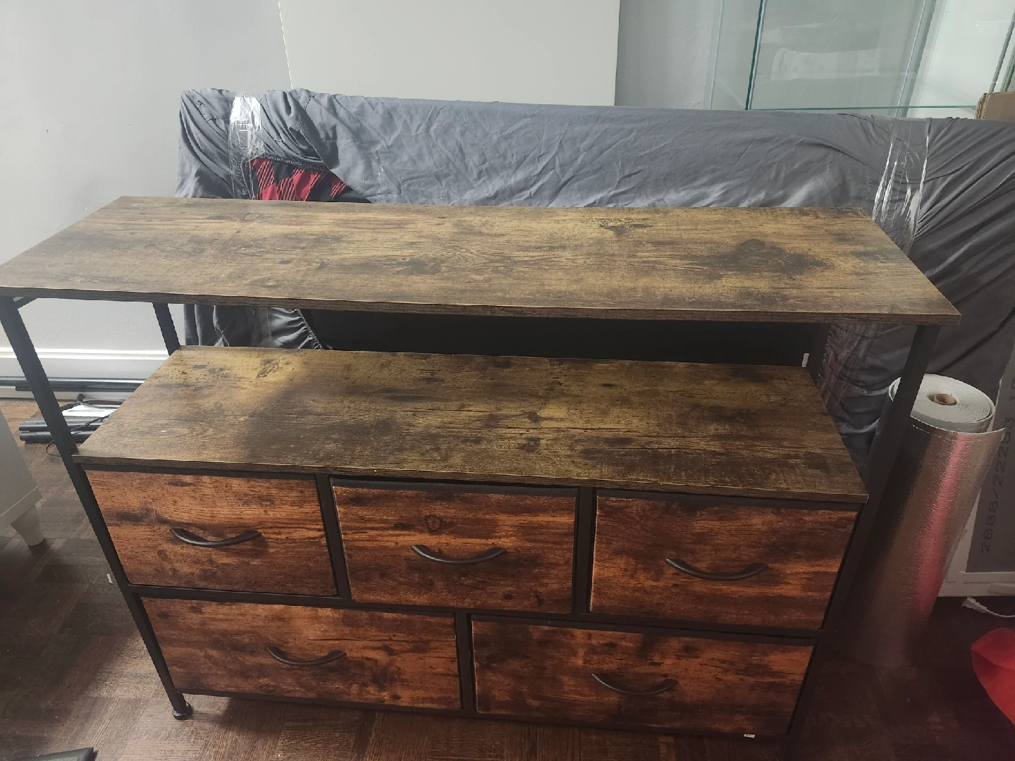 Pick up only. LUKGEL 5 drawer storage unit with shelf can be used as a dresser for Bedroom, Console Sofa Table, or an entryway table. Comes in Rustic Brown colour. Drawers are fabric, but the frame is metal and the shelf and top are MDF with laminate.