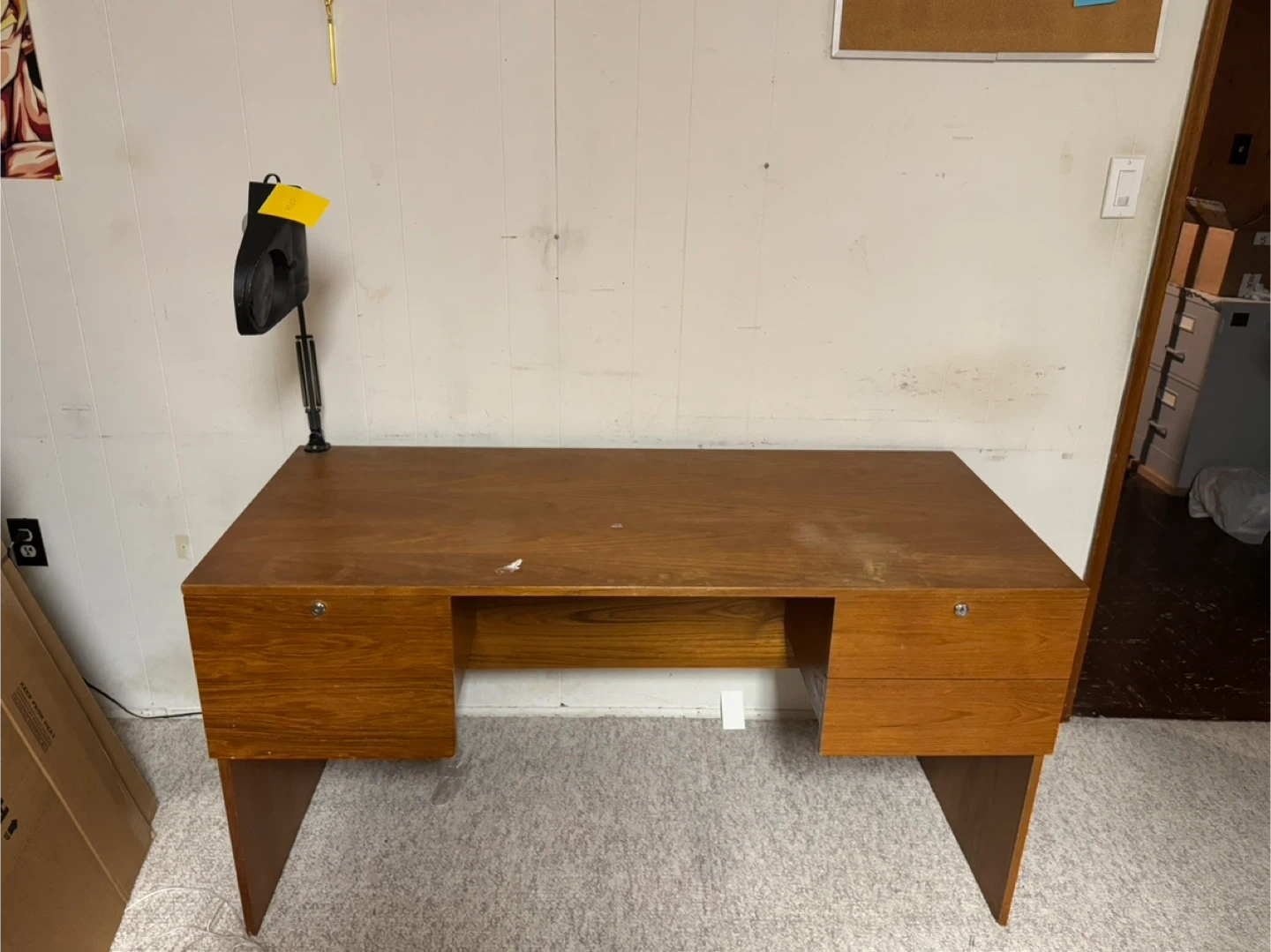 Selling a wooden desk with drawers. It's a great piece for a home office or study space. It has a classic look and is in good condition. Perfect for anyone needing a sturdy and functional desk. Lamp not included