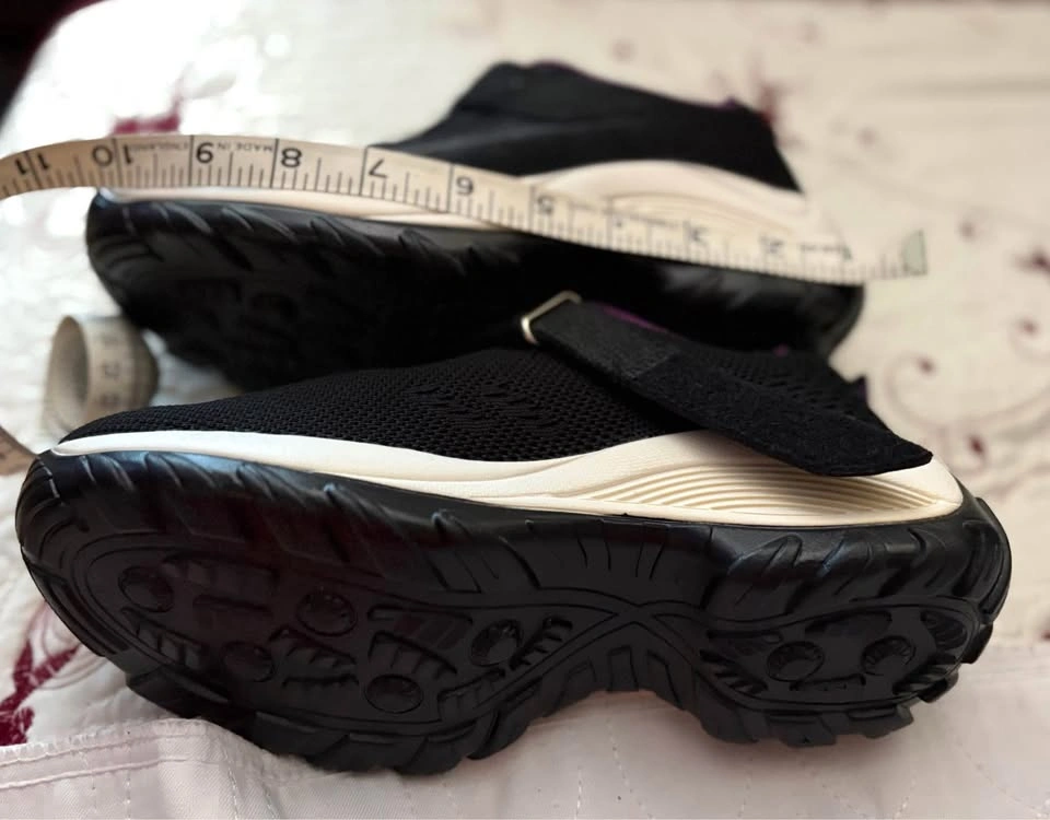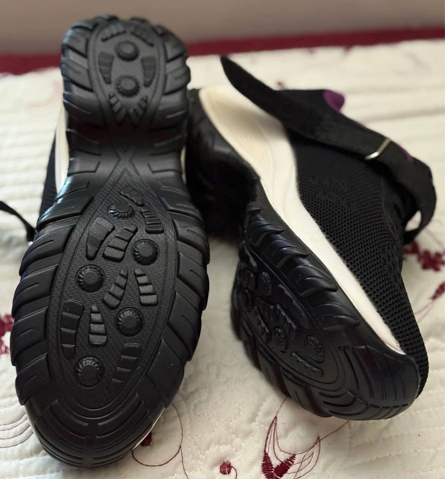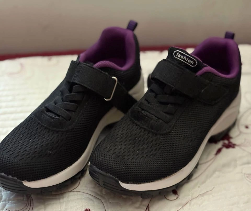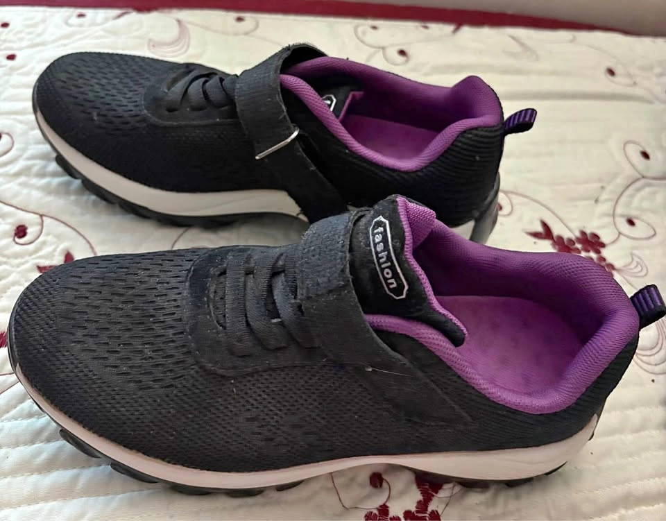 Fashion shoe upper black with strap closure lilac color edge &inside & white mid lower black sole