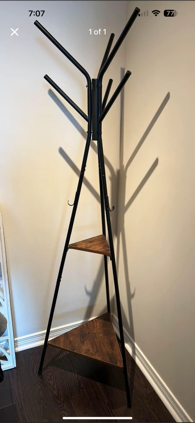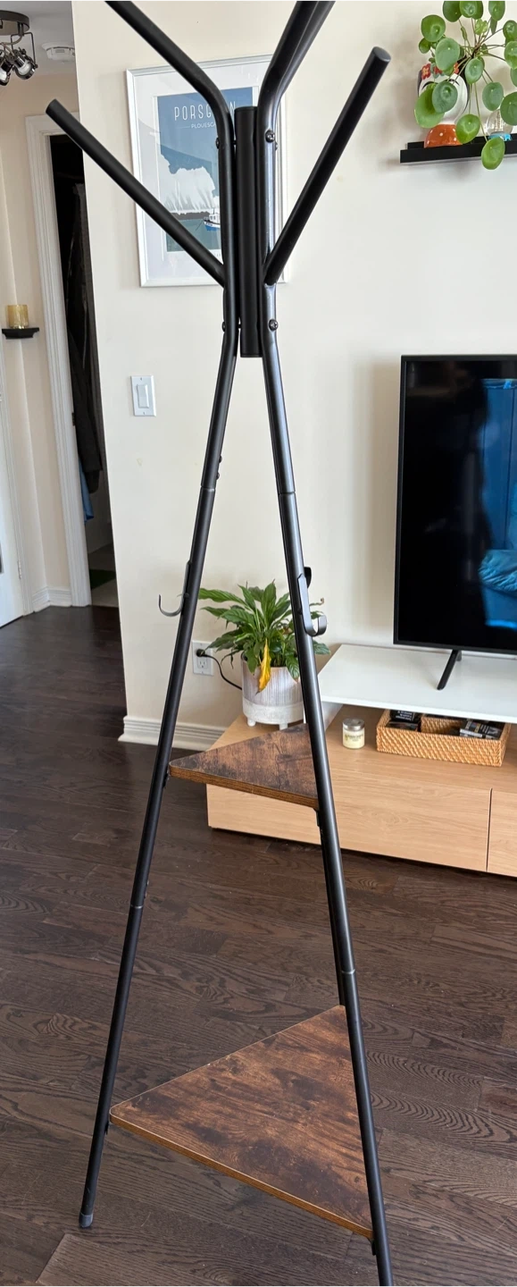 This coat rack is perfect for keeping your entryway organized! It features a sturdy black metal frame with two wooden shelves for extra storage. Great for hanging coats, hats, and bags, and the shelves can hold shoes or other items. It's in good condition and ready for a new home