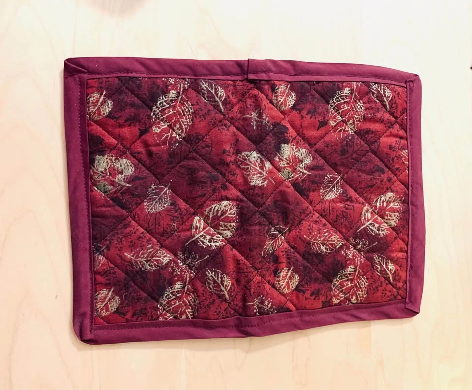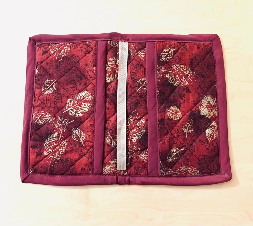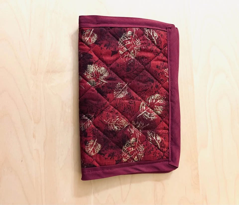 65Magenta book cover with leaf print in darker magenta and gold. Has gold ribbon as bookmark. Measurements on the outside 11.25” x 8.75”. Will fit book with measurements of 9” x 7”.