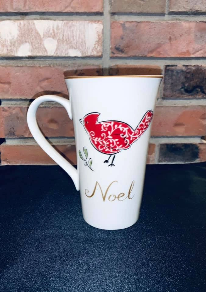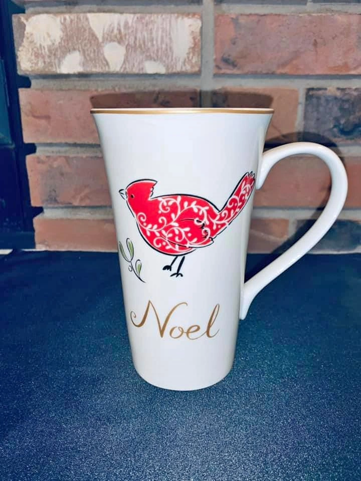 65Excellent condition. Fine Porcelain. Tall mug at 6.25”. Gold rim and noel. Red cardinal or bird.