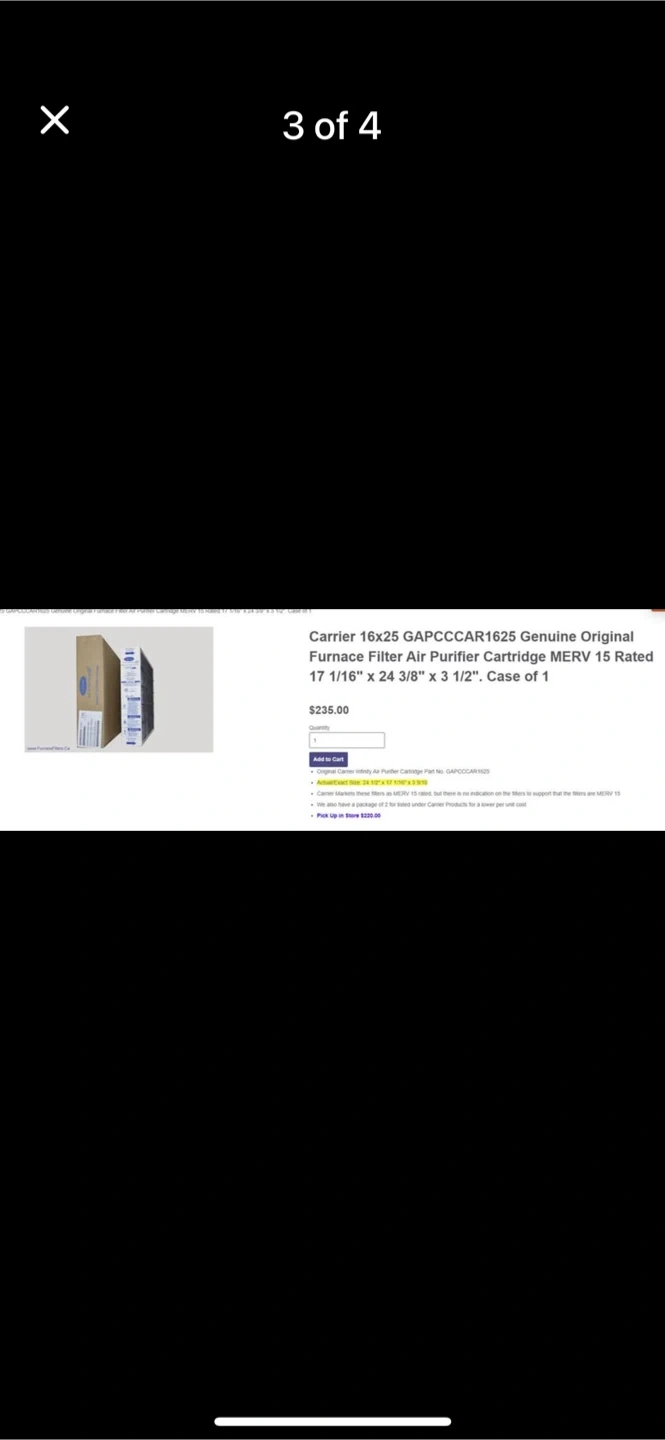 21Selling a Carrier Infinity Air Purifier Cartridge, model number GAPCCCAR1625-A01. This is a genuine original furnace filter air purifier cartridge, MERV 15 rated. It's sized at 16x25x1 inches. The original price was $238.00. The box is included!
