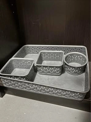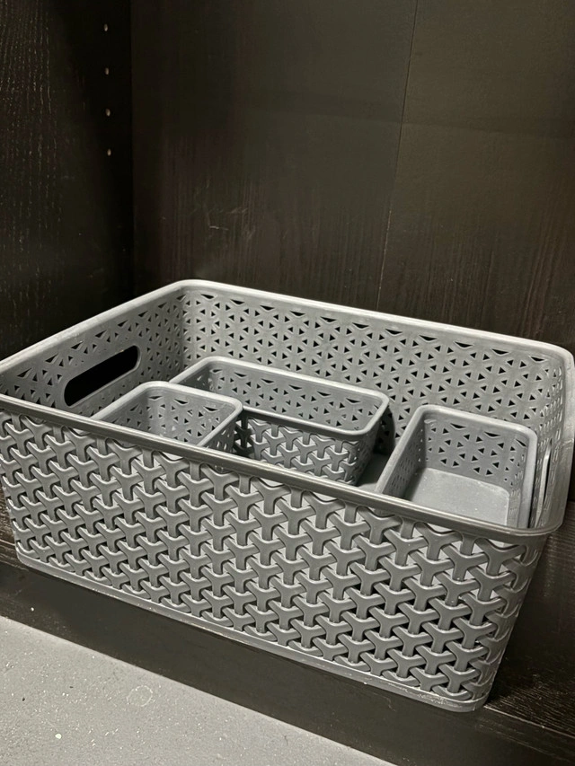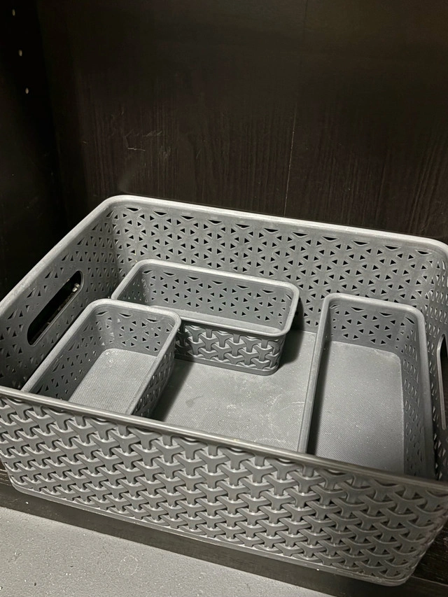 43These grey organization baskets are perfect for tidying up any space! Ideal for drawers, shelves, or countertops. They've been gently used, and are ready for a new home where they can bring order and style. Perfect for organizing a home office or walk-in closet. Total of 8 baskets of varying sizes. The two largest baskets are about 13.5 inches in length, 11.5 inches in width so they stack within each other, one of them has about double the depth (deepest one about 5.5 inches) * Durable plastic material * Stylish grey colour. Pick up near Queen and Gladstone.