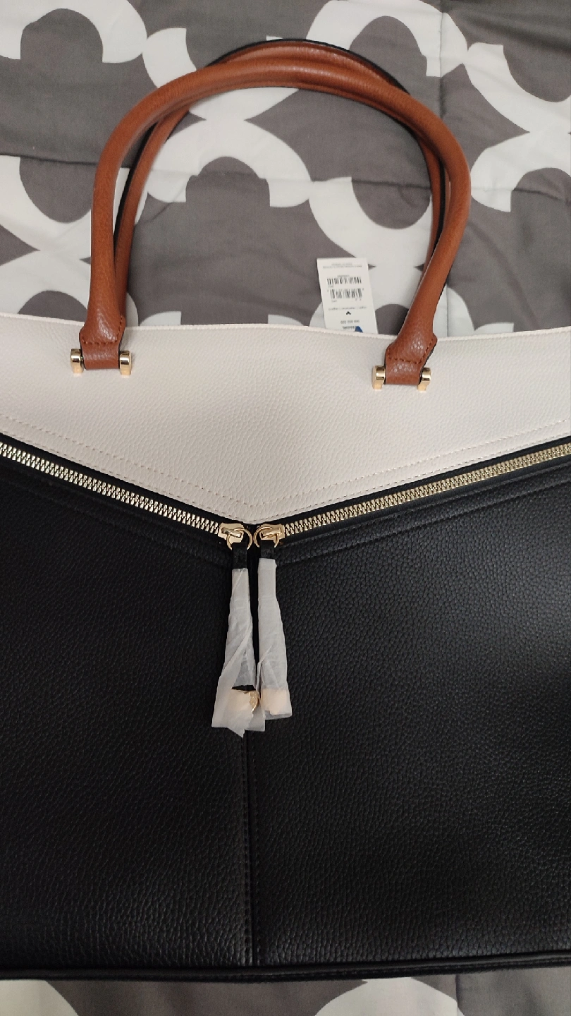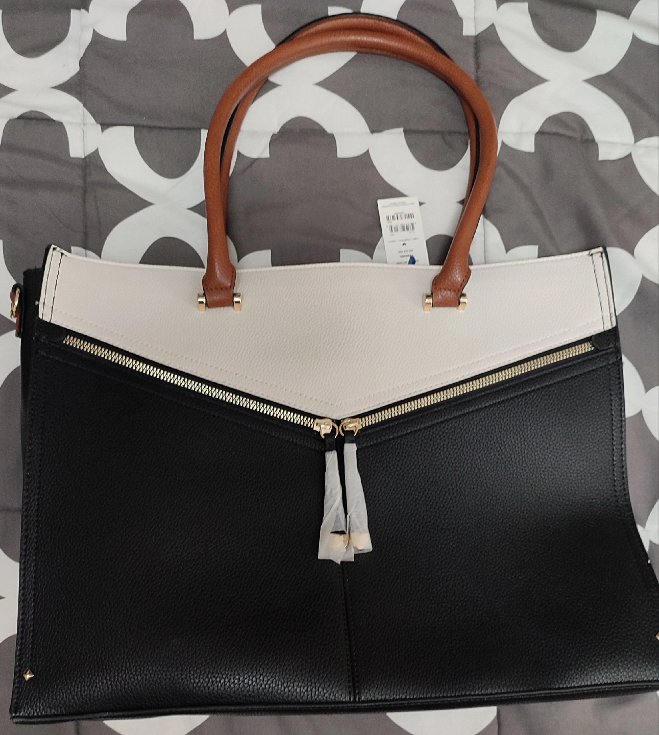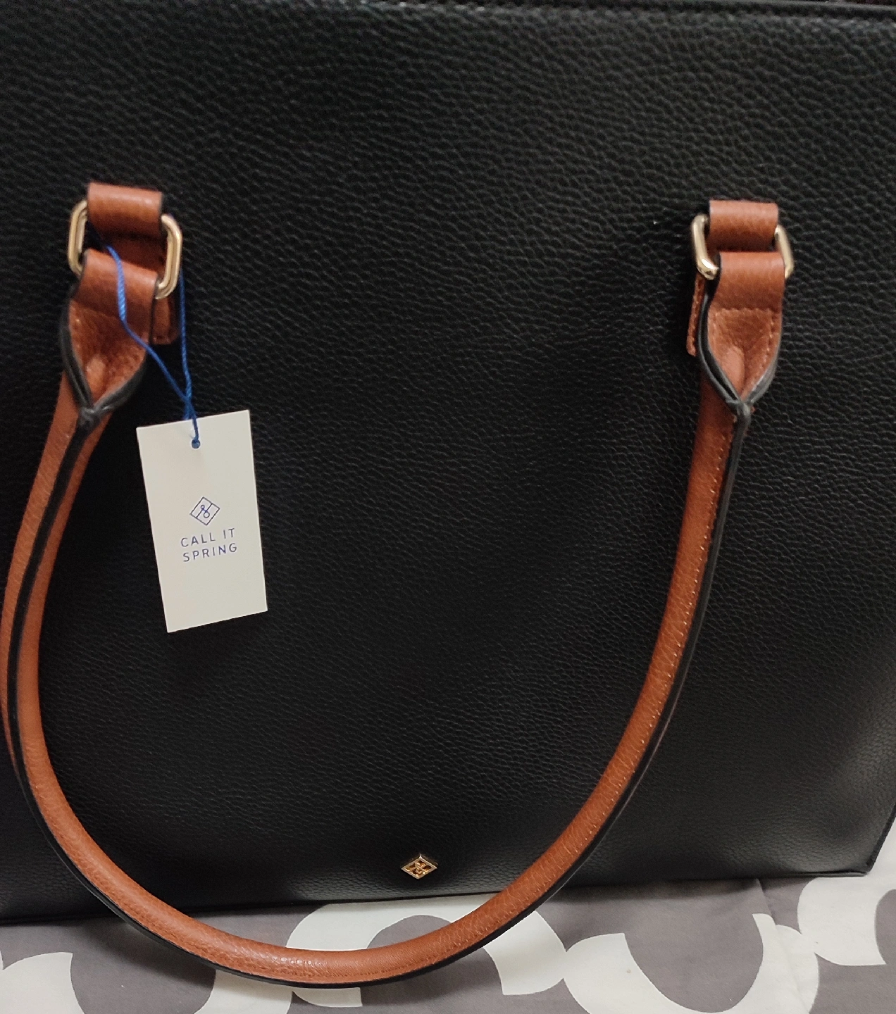 This is a brand new call it spring tote bag! It features a stylish black and white colour block design with brown handles. It also comes with an additional strap for crossbody wear. Perfect for everyday use!