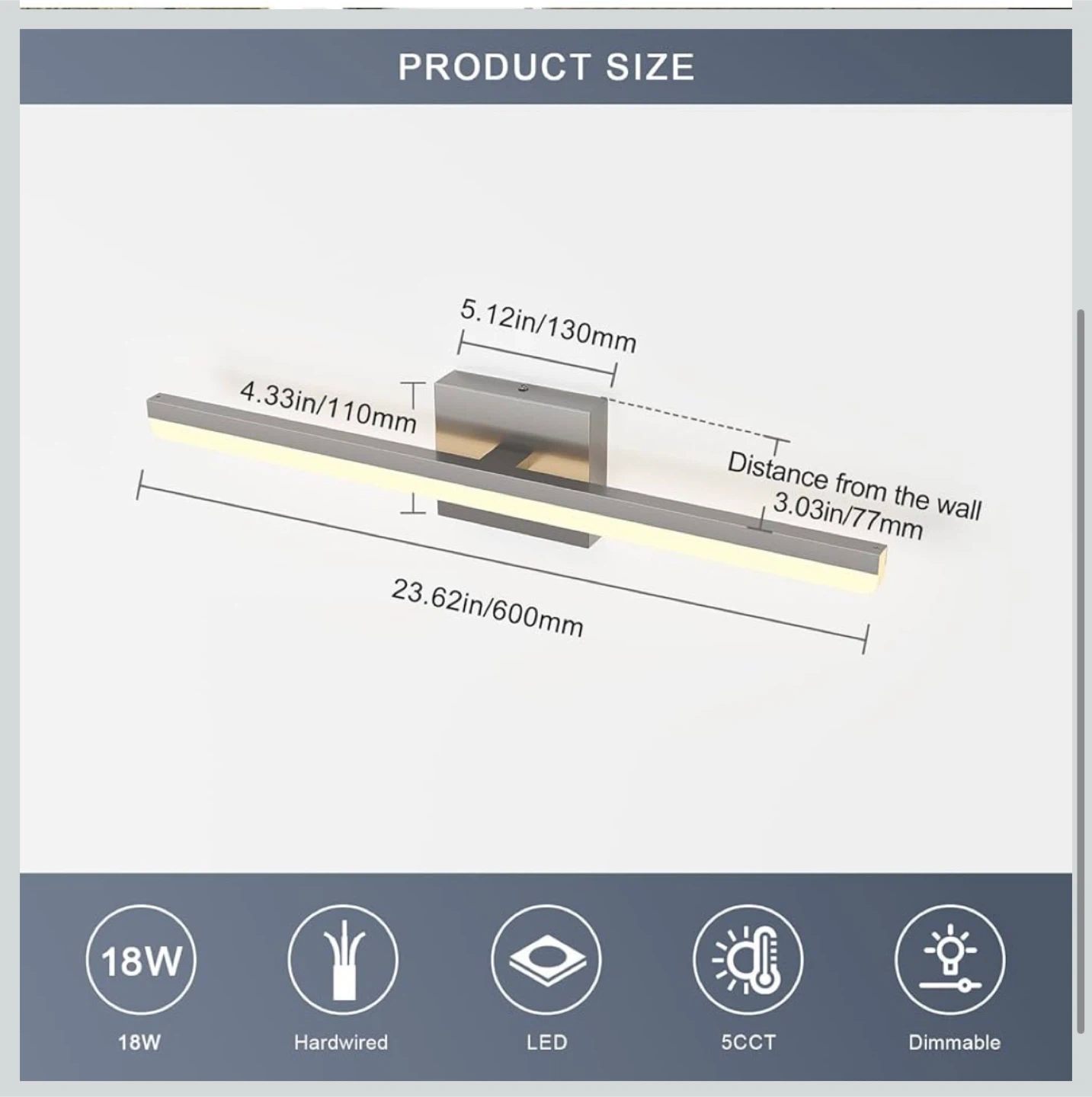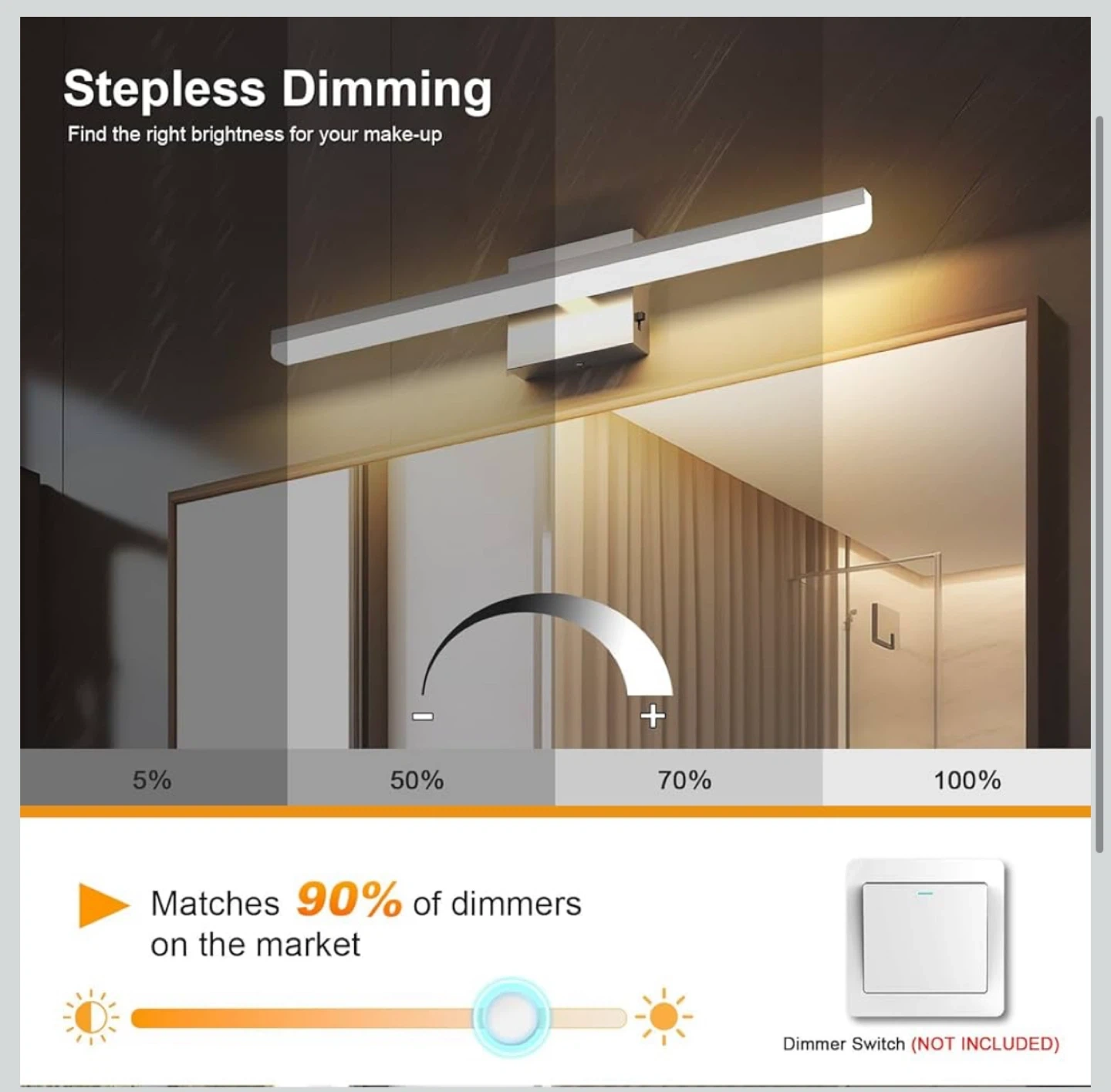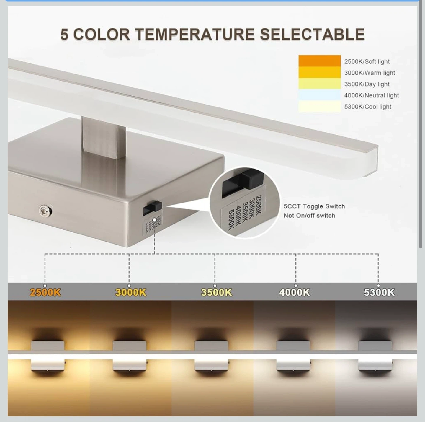Add a touch of modern elegance to your bathroom with this LED vanity mirror light! This light features 5 selectable colour temperatures, ranging from a soft 2500K to a cool 5300K, so you can customize the lighting to your preference. It also has stepless dimming to find the right brightness for your make-up.