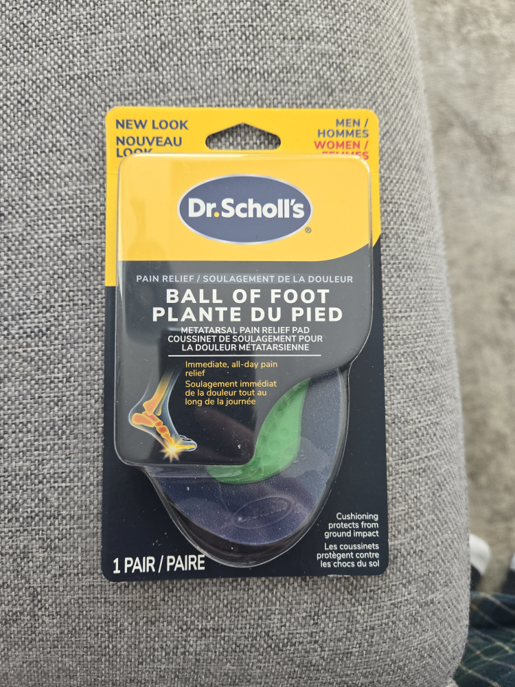 Selling a new Dr. Scholl's Ball of Foot Plantar Pain Relief Pad. It provides immediate, all-day pain relief and cushioning that protects from ground impact. Comes with 1 pair of metatarsal pain relief pads.