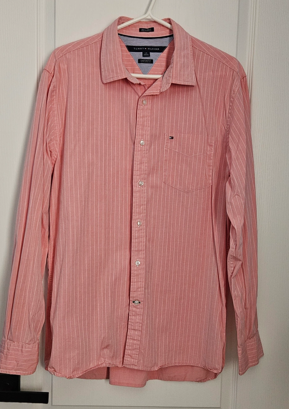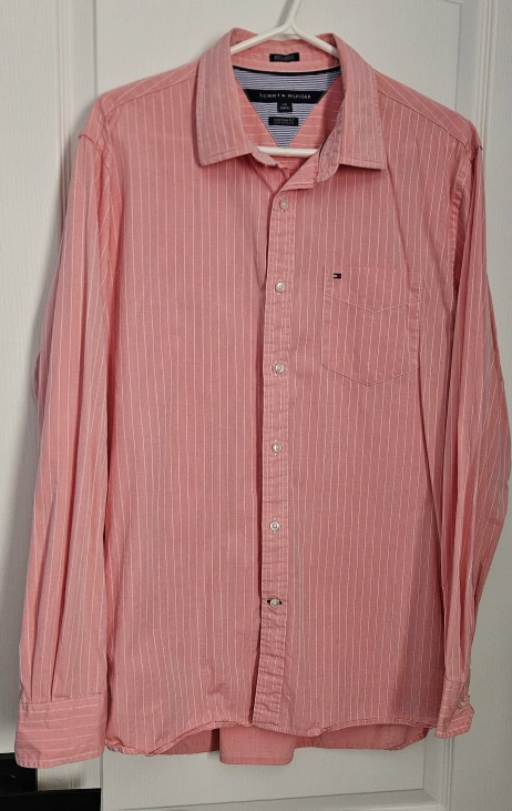 Tommy Hilfiger dress shirt in size large. In excellennt condition. The shirt is a light pink colour with white stripes. Perfect for business casual or a night out