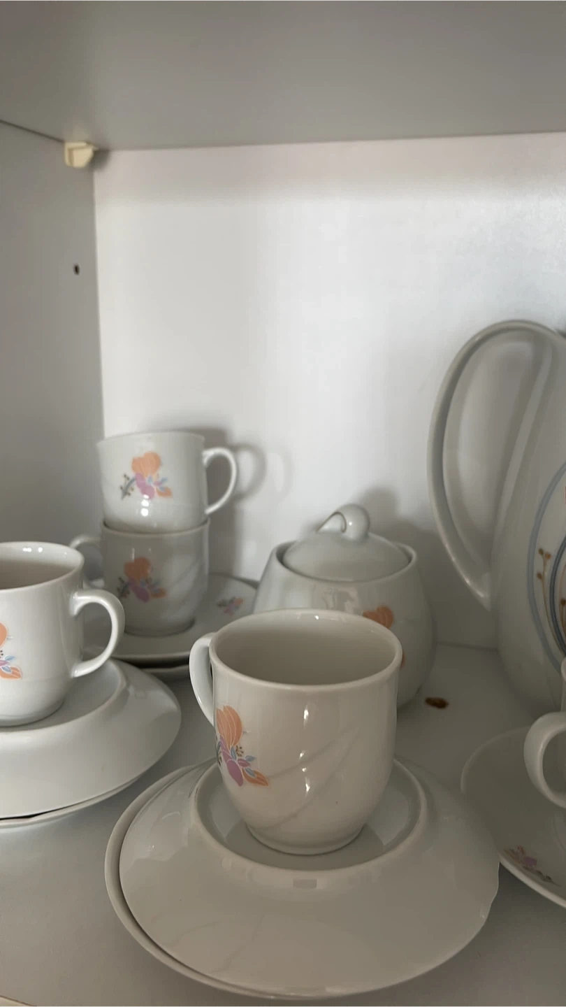 Selling a beautiful Vohenstrauss Johann Seltmann Bavaria coffee set black ! It includes cups, saucers, a coffee pot holder a creamer, and a sugar bowl. The set is white with a delicate floral design. Perfect for tea parties or everyday use from Italy