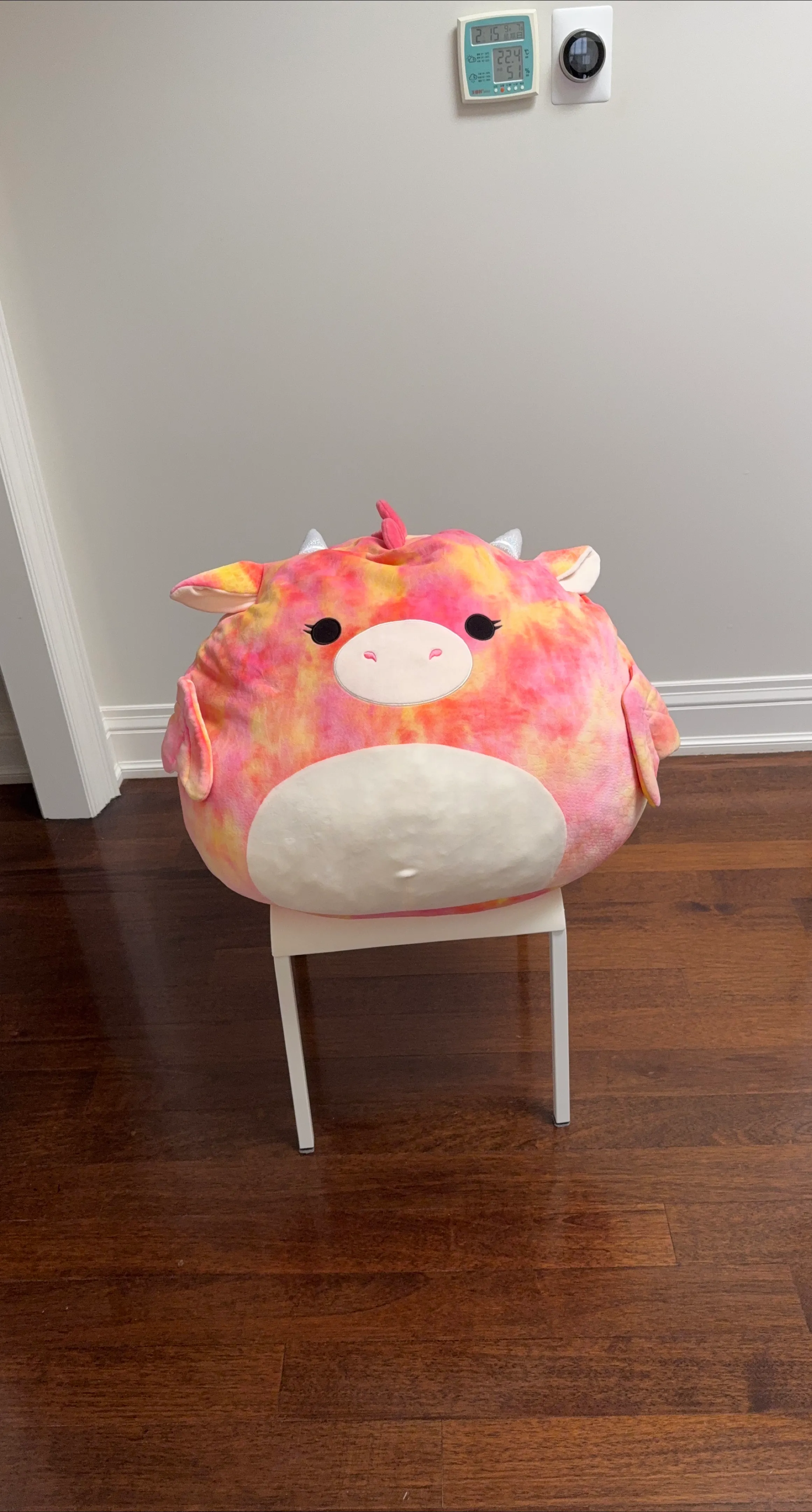 Here's a cute Squishmallow plush toy! It features a pink and yellow tie-dye pattern with a white belly. It's in great condition and ready for a new home