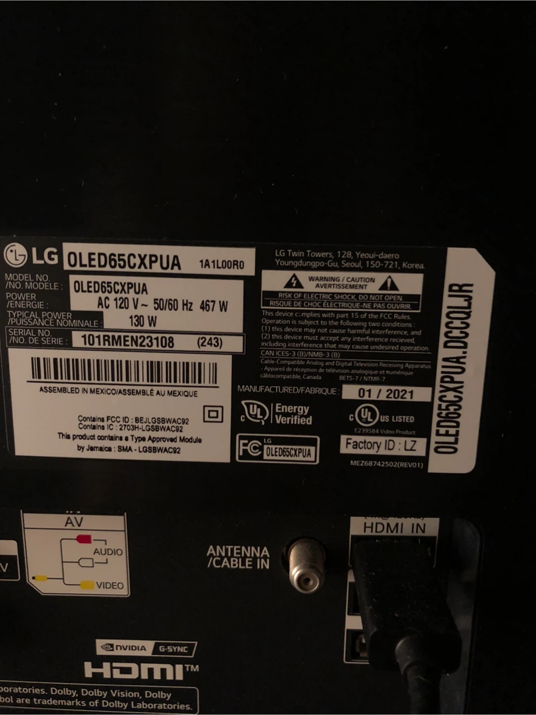 Selling a 65-inch LG OLED TV, model OLED65CXPUA. This TV is from the C Series and offers amazing picture quality. Great condition no burn in no dead pixels
