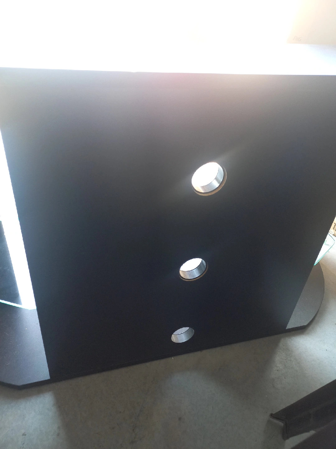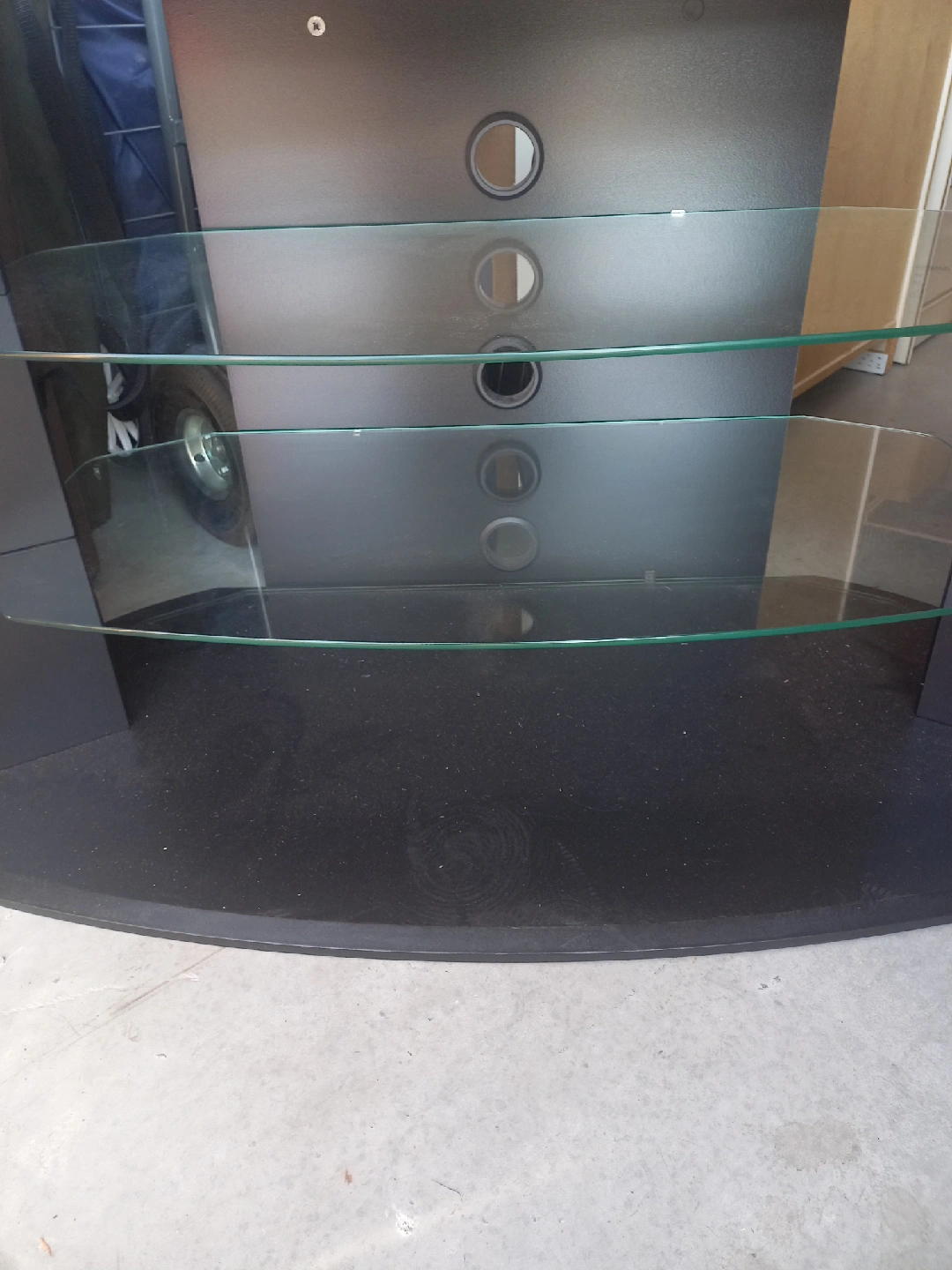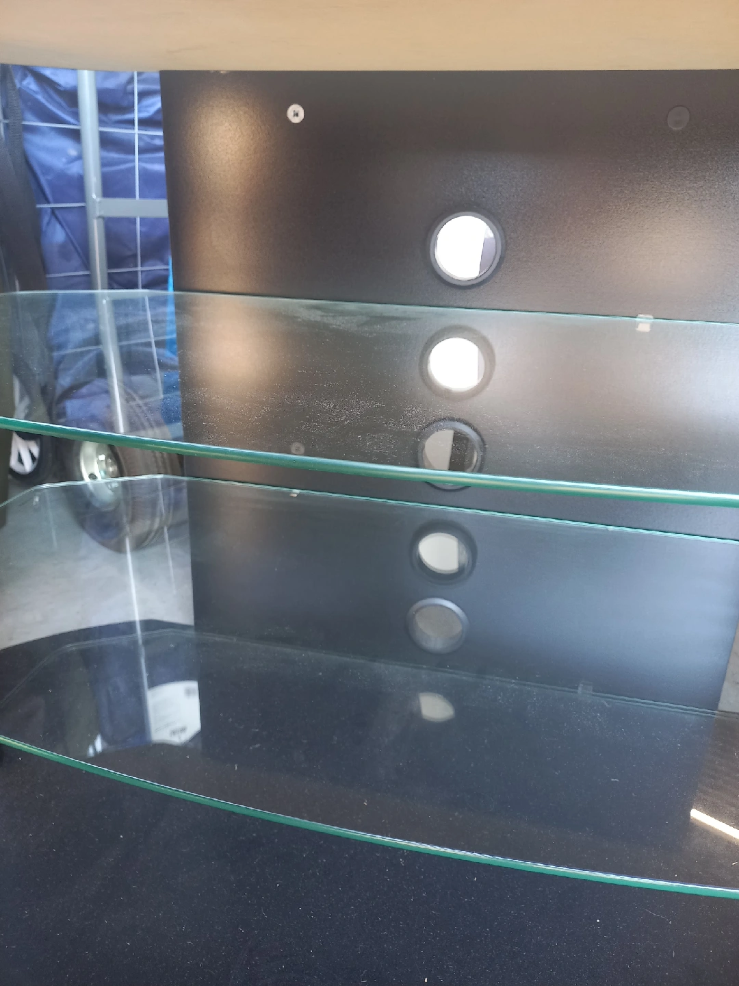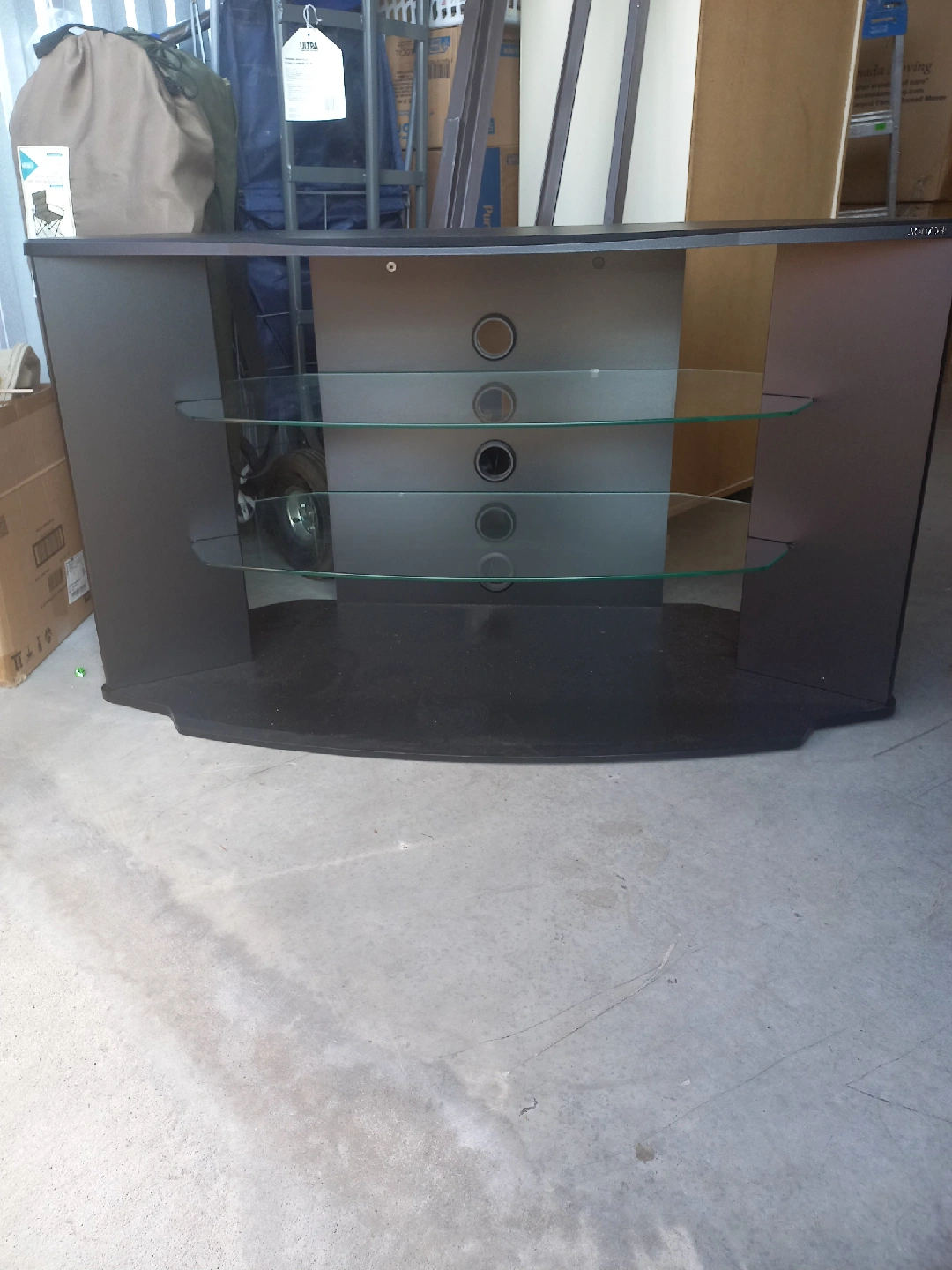 Sleek black TV stand, perfect for your entertainment setup. It features three glass shelves, offering plenty of space for your devices and media. In great condition and sturdy except for small knick shown in the photo which will be hidden by the TV.