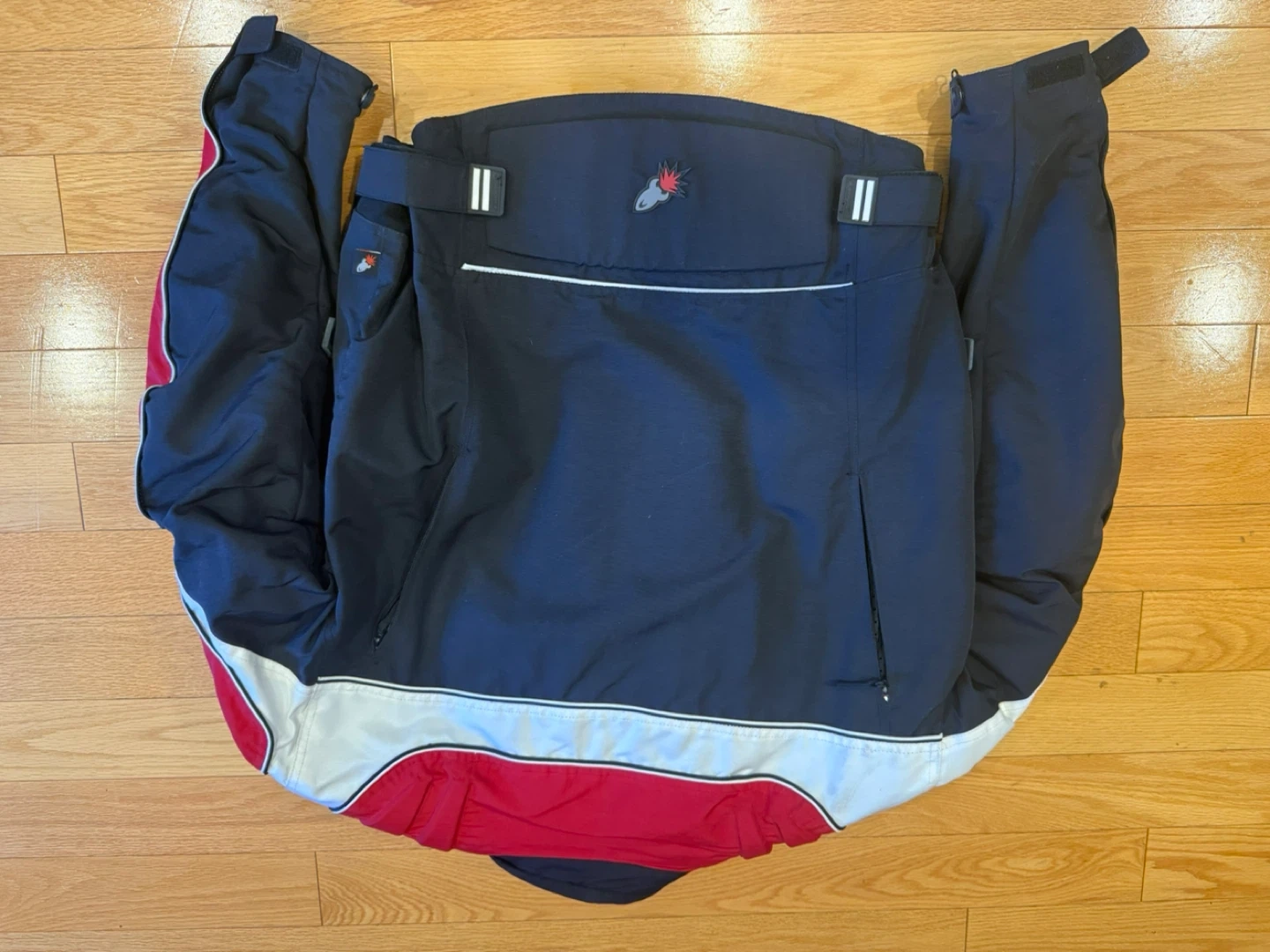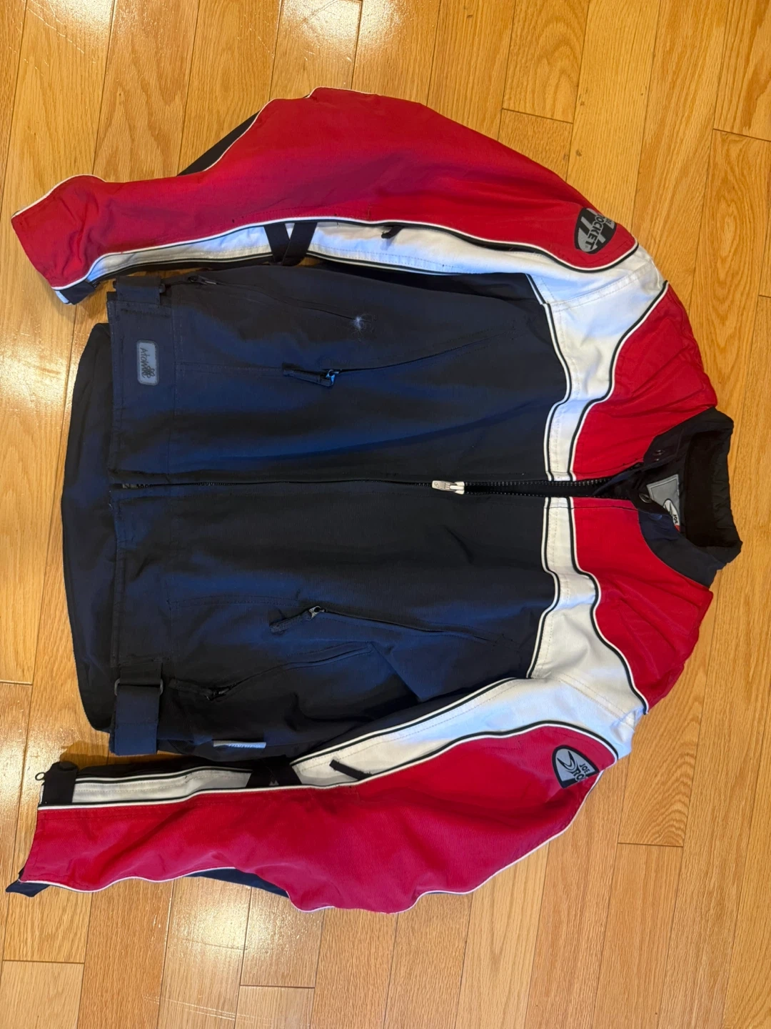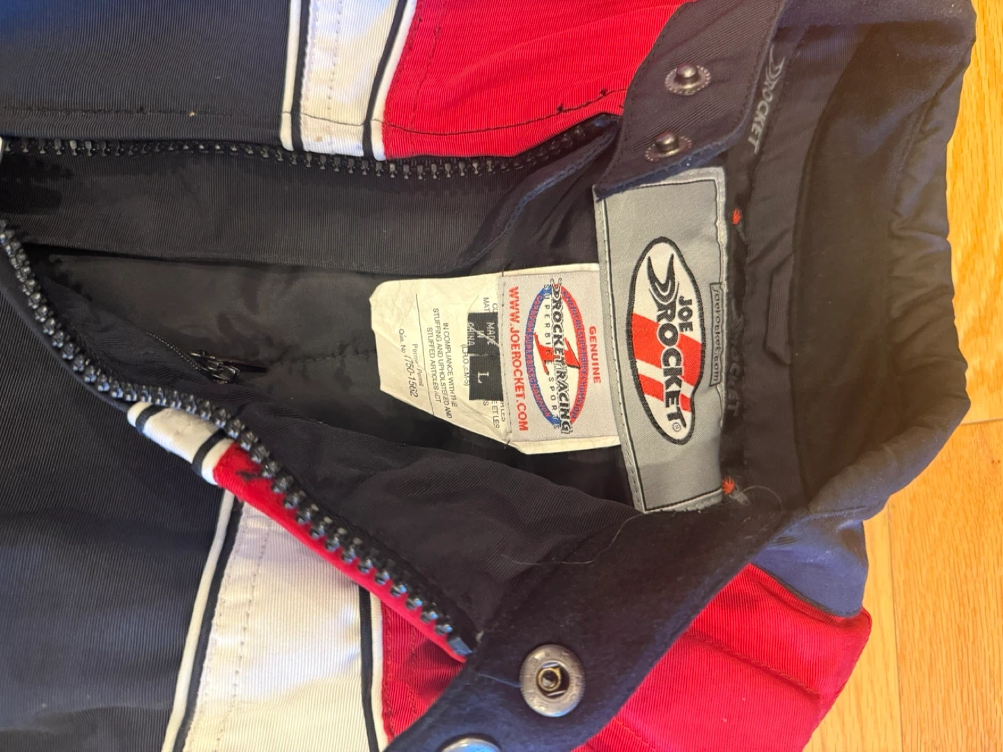 Joe Rocket Racing jacket in size L. It's in great shape and ready for a new owner! The jacket features a stylish red, white, and black design. Perfect for motorcycle enthusiasts or anyone looking for a cool jacket with elbows, shoulders and back pads.