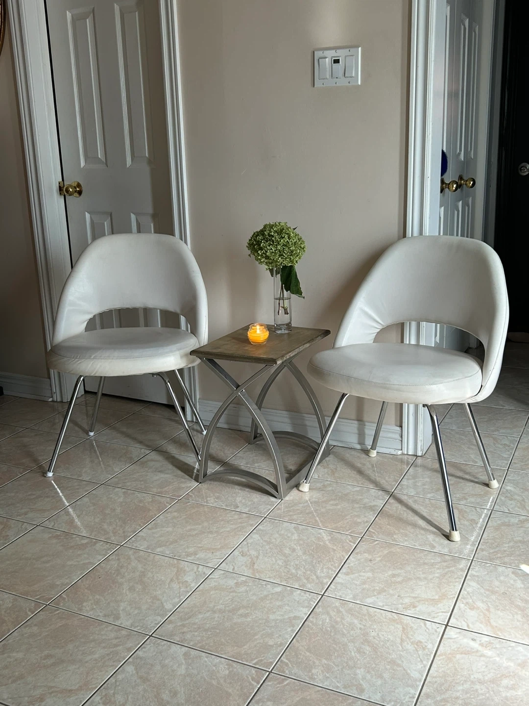 Selling a set of two stylish white tulip chairs! These chairs are in great condition and would look great in any dining room or living space. The tulip design adds a touch of modern elegance to any home. They are comfortable and sturdy, perfect for everyday use. Grab them before they're gone