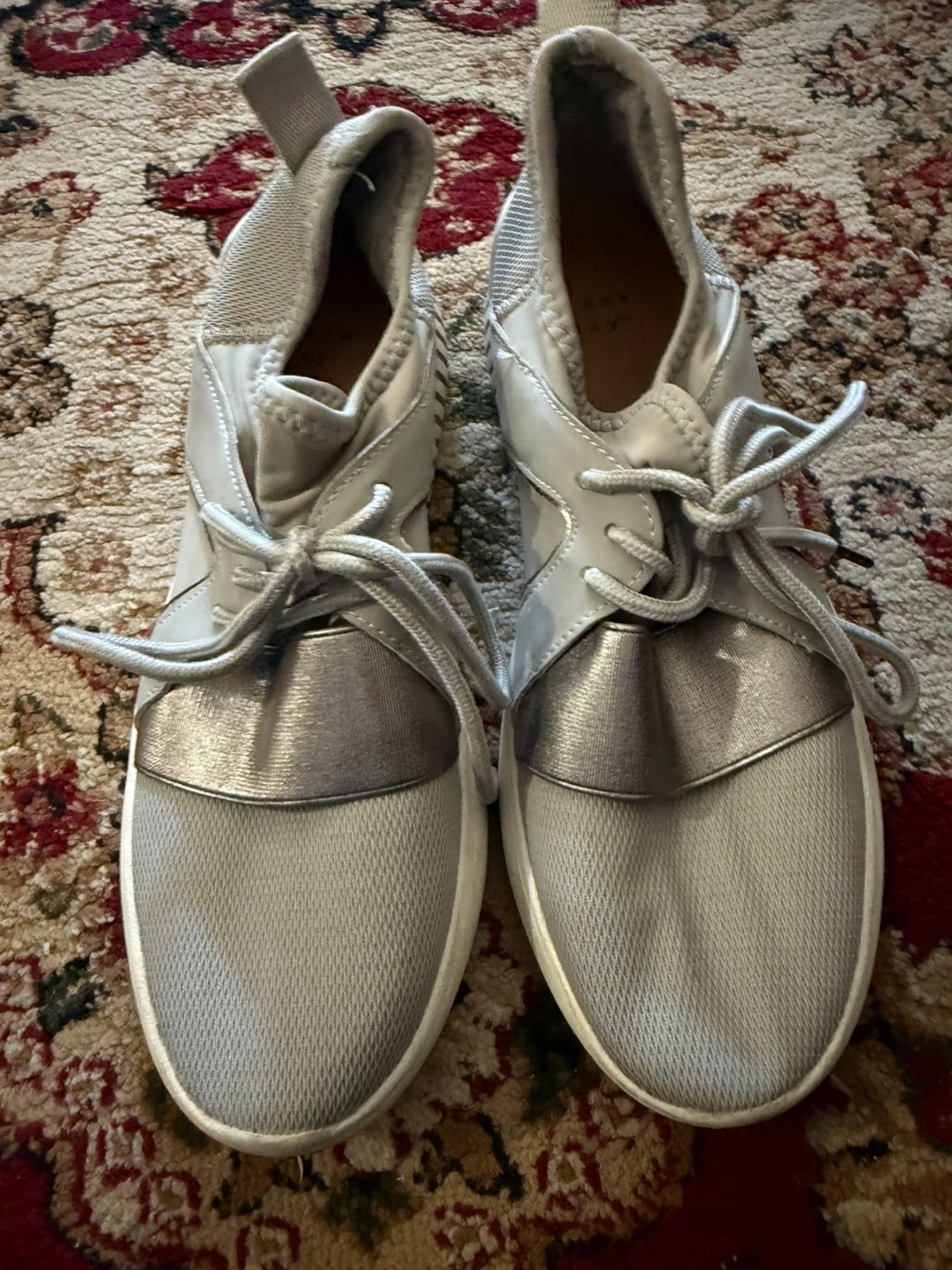 Selling a pair of New Day sneakers in silver. They're a size 7.5. They have some wear on the soles, as shown in the photos, but still in good condition.