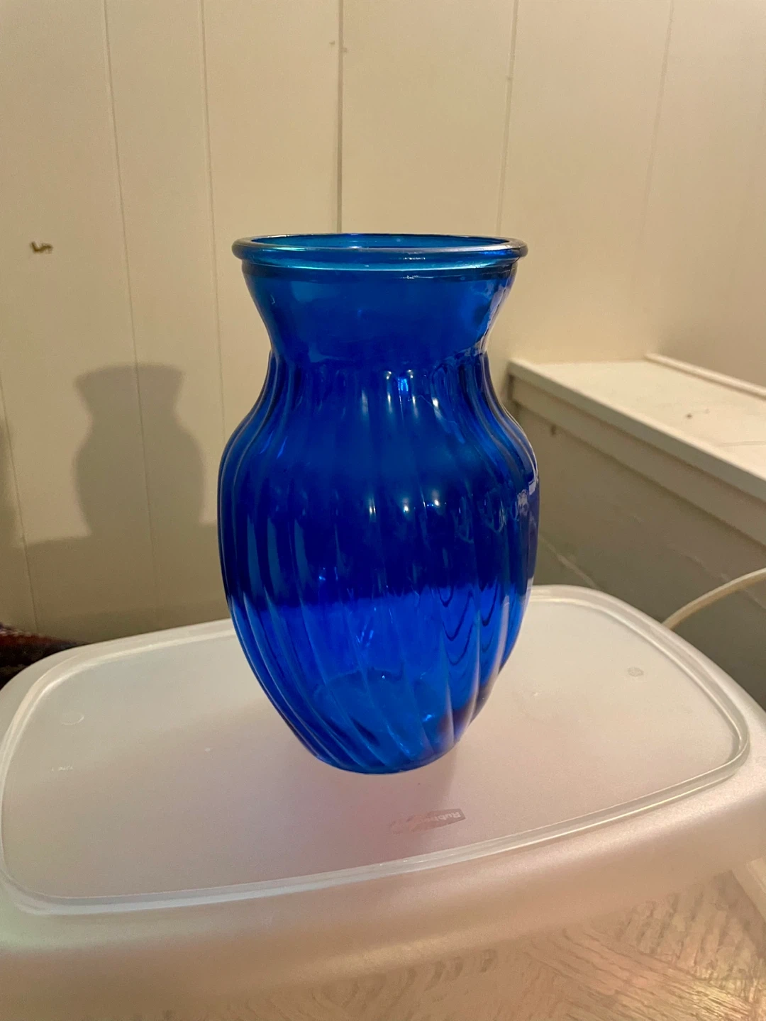 A beautiful blue glass vase is up for grabs! It has a lovely wavy design and would look great with flowers or as a standalone decorative piece