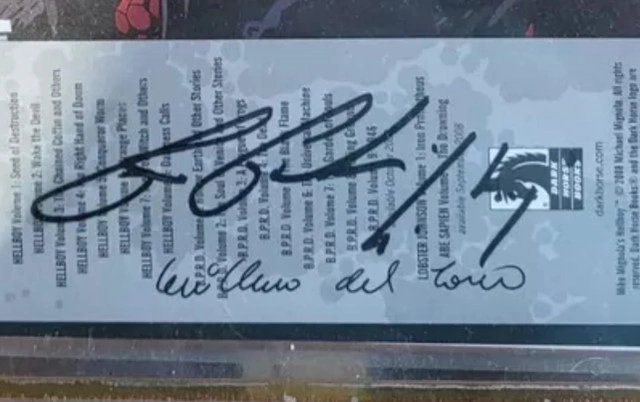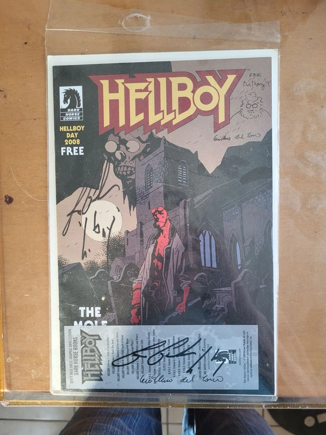 Get your hands on this rare signed copy of "HELLBOY Day 2008 The Mole and other Stories" signed by Guillermo del Toro and Ron Perlman. This US comic tradition series from Dark Horse features the beloved main character, Hellboy, in a collection of thrilling stories. Published in 2008, this personalized edition is a must-have for any Hellboy fan and collector. Also included is an autographed Dark Horse bookmark. Condition: Used - Like new More Info: Pop Culture Collectibles