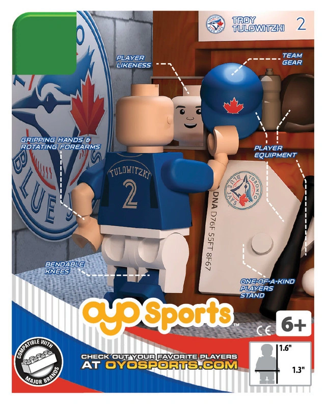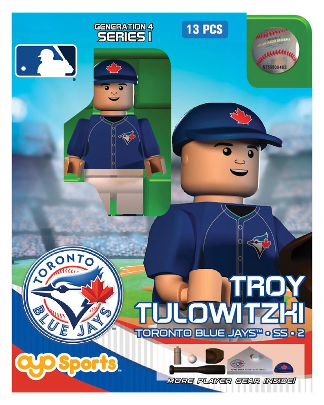 OYO Toys Building Brick Mini-figure of Troy Tulowitzki, dressed in his blue jersey. This action figure is perfect for fans of the Toronto Blue Jays. Made of durable plastic, this multicolored figure is a great addition to any display or playtime activity. The attention to detail in the design of this mini-figure accurately captures the likeness of Troy Tulowitzki. Minifigure looks just like the real player. Accessories include a team hat, a glove, ball, bat, water bottle and uniquely numbered stand. OYO Sports minifigures feature proprietary bendable knees and poseable arms which allow them to catch, swing and throw. New condition.