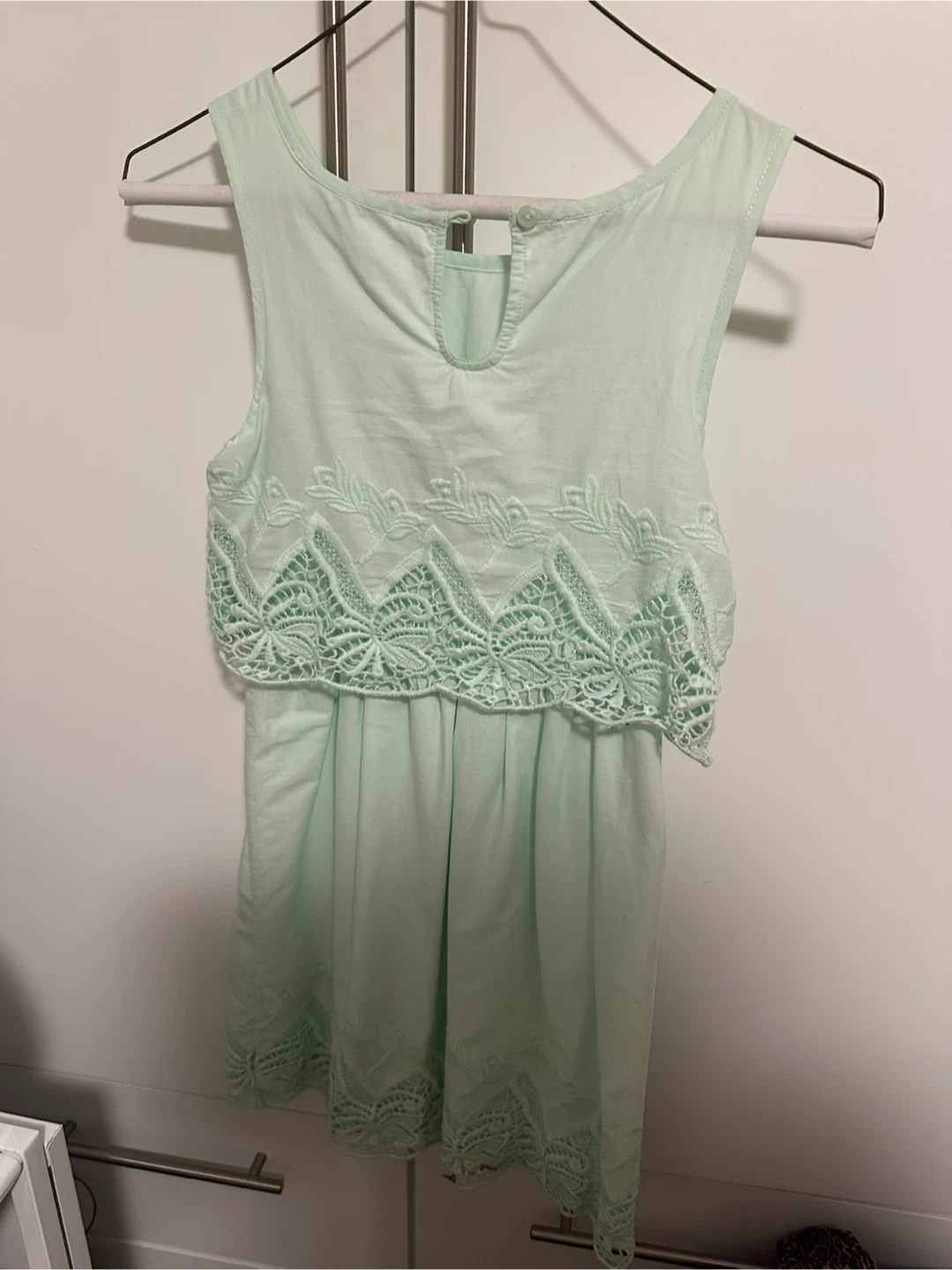 A cute mint green dress with delicate lace detailing. It's in great condition and ready for a new home! Perfect for summer days or dressing up for a special occasion. It's a lovely light colour!