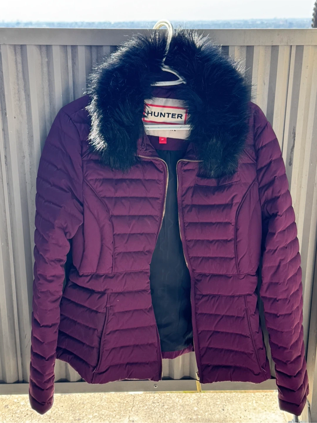 Selling a stylish Hunter down puffer jacket in a beautiful burgundy colour! It features a cozy faux fur collar, perfect for adding a touch of warmth and elegance to your winter outfits. This jacket is a size medium and the waist can be cinched