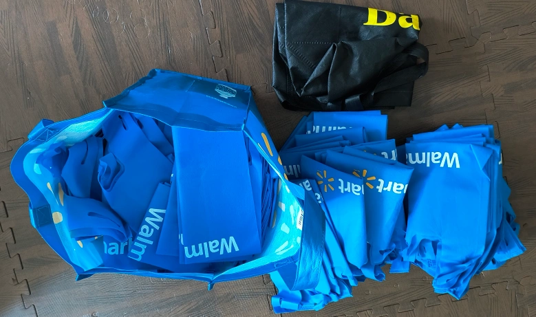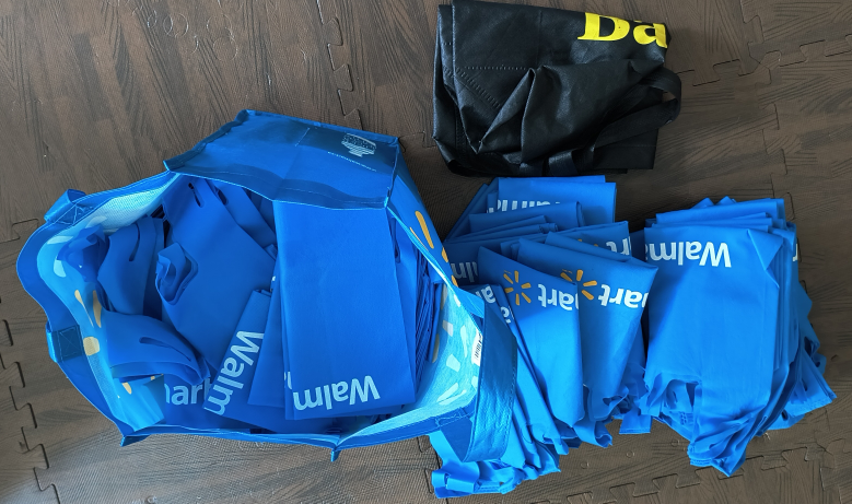 A bunch of blue reusable shopping bags from Walmart! Great for groceries, errands, or anything else you need to carry. Get them all in one go!