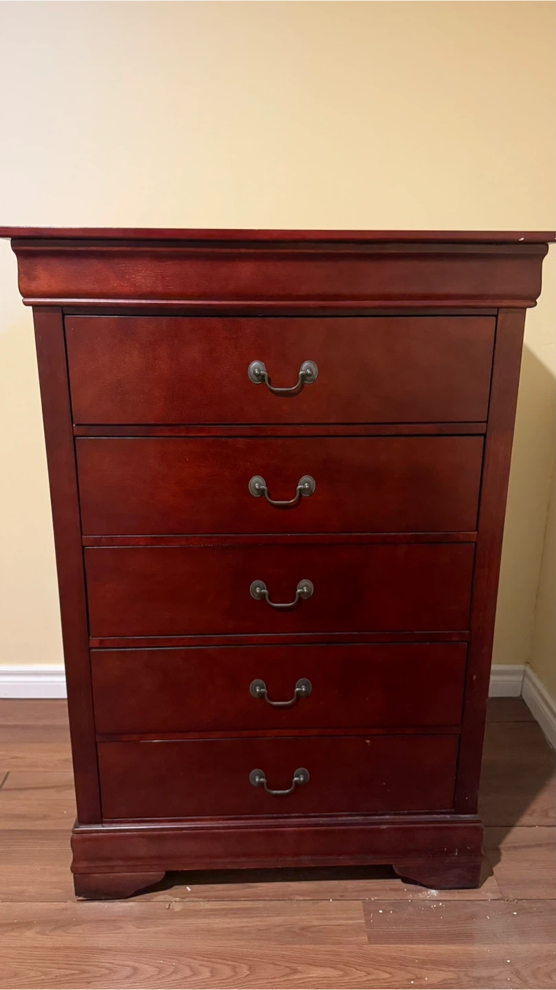 Here's a wooden chest with five drawers. It's in good condition and would be great for a bedroom or any room needing some extra storage