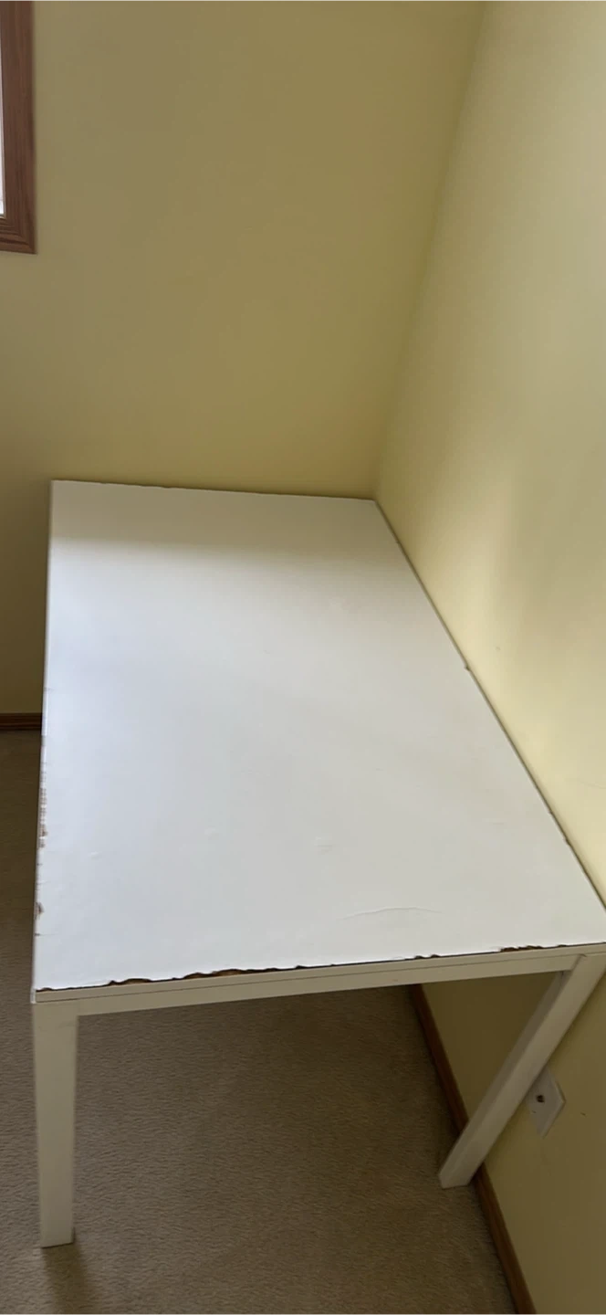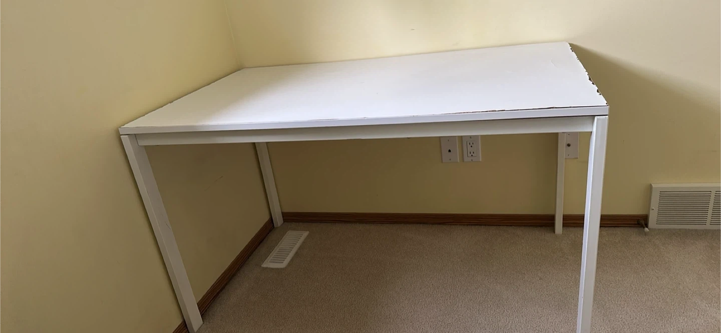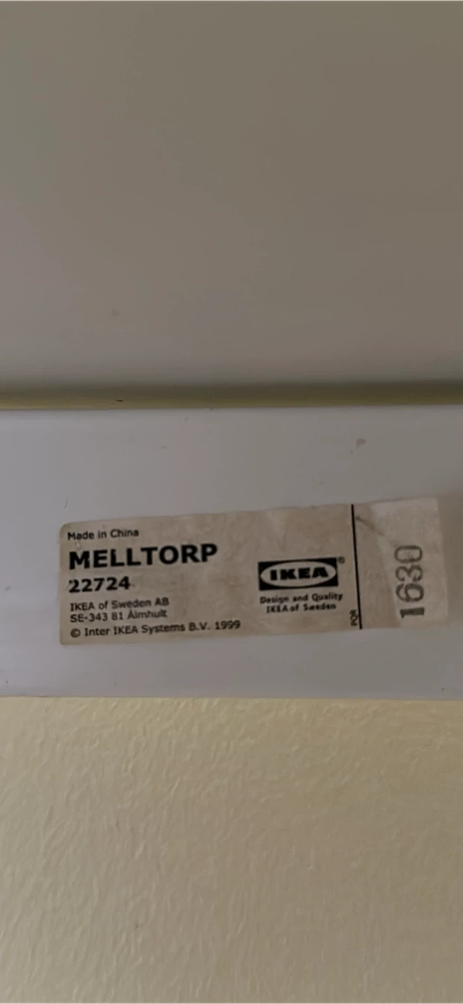 Selling a white IKEA Melltorp desk. It's a simple and functional desk, perfect for a home office or study space. It's in used condition, with some signs of wear on the top surface as shown in the pictures. Still sturdy and ready for a new home!