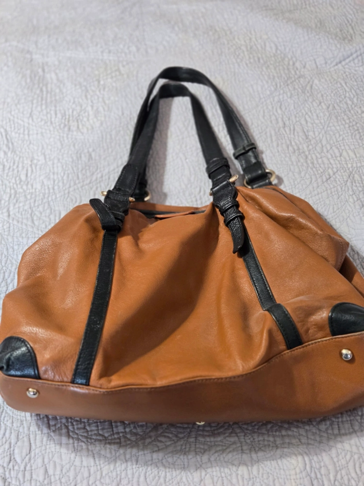 A stylish brown leather Wayne Clark handbag with black accents. It's in good condition and ready for a new home! The bag features a soft leather exterior and a spacious interior, perfect for everyday use. The black detailing adds a touch of sophistication to the overall design
